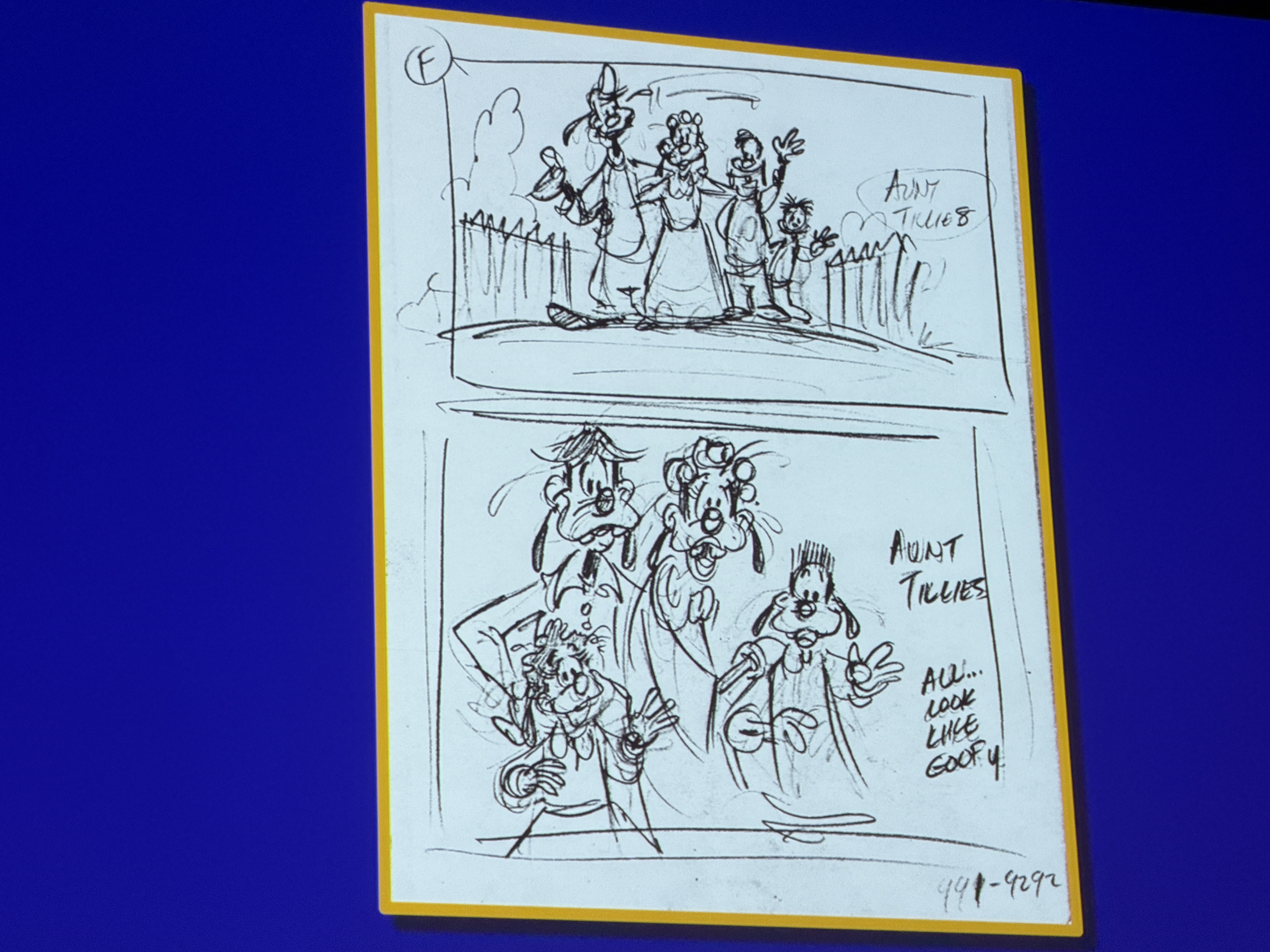 The crew also previewed a storyboarded deleted song written by William Finn. The number had Pete gleefully taunting Goofy with Max’s doomed future, spiraling into a surreal sequence where Max goes to literal hell and winds up in an electric chair. The set-piece proved too much — tonally and time-wise — but one image survived as dialogue: Goofy’s fear that Max will end up in “the electric chair.”