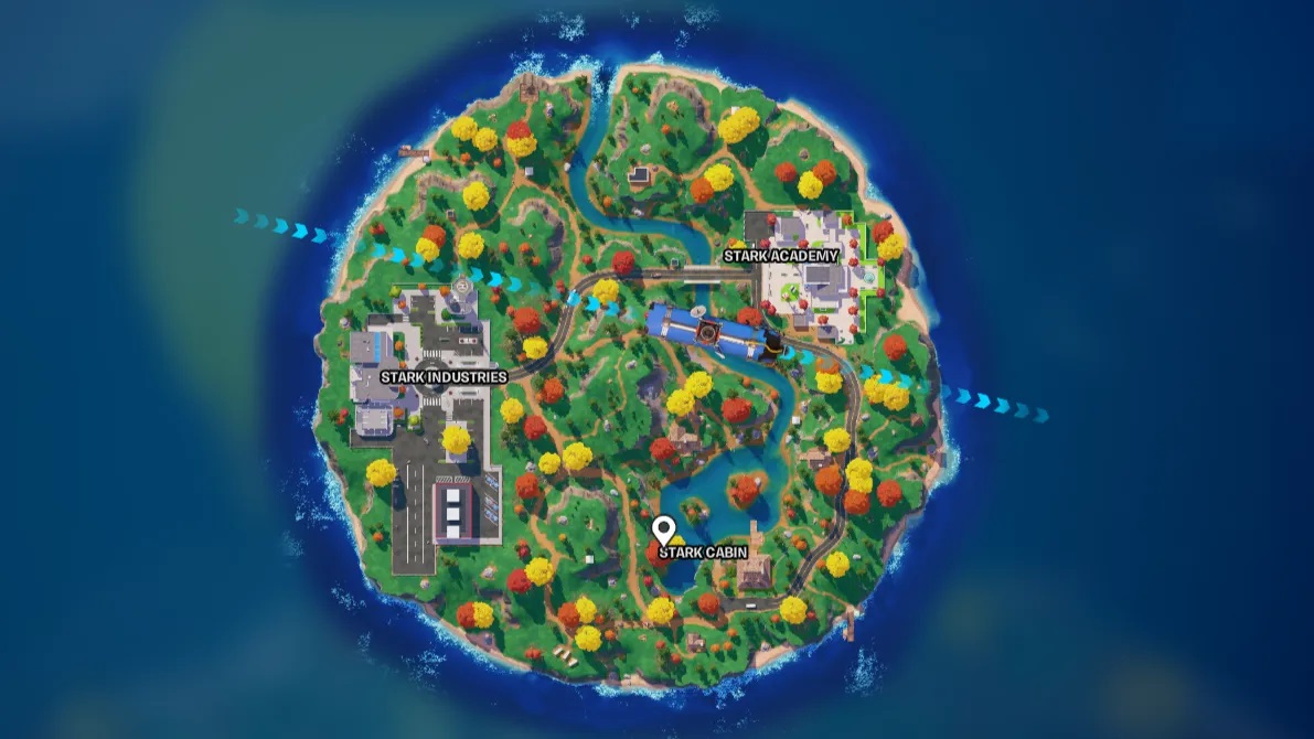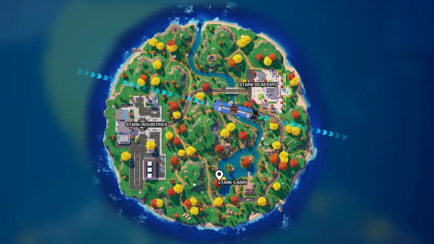 - The island features three themed locations inspired by Fortnite’s Chapter 2 Iron Man collaboration: Stark Industries, Stark Cabin, and Stark Academy.