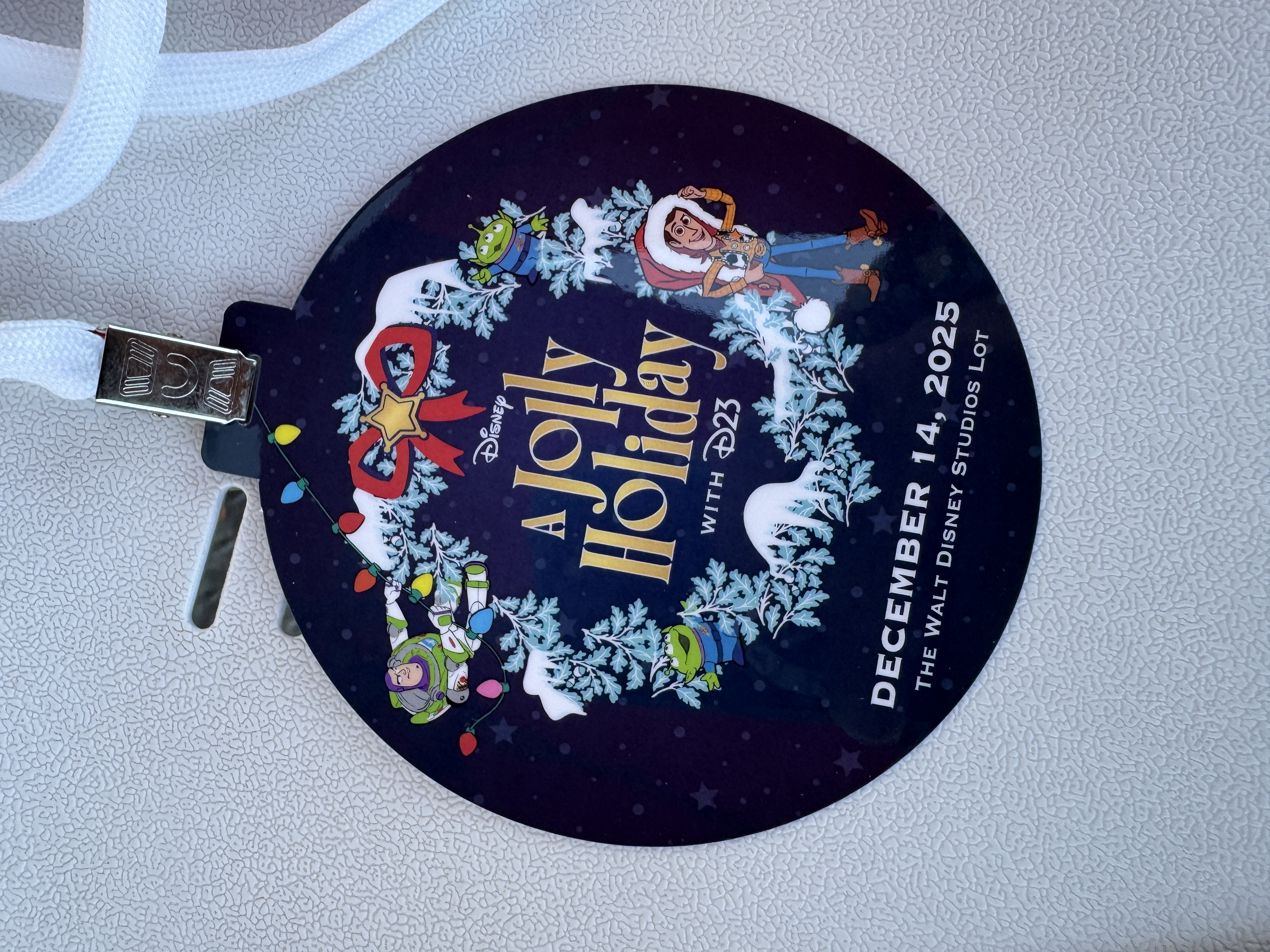 Upon checking in, I received some swag included with the price of admission, which was paid for by Laughing Place: a D23 ornament celebrating the 30th anniversary of Pixar's Toy Story, an event credential, and a magnet frame in promotion of A Very Jonas Christmas Movie on Disney+.
