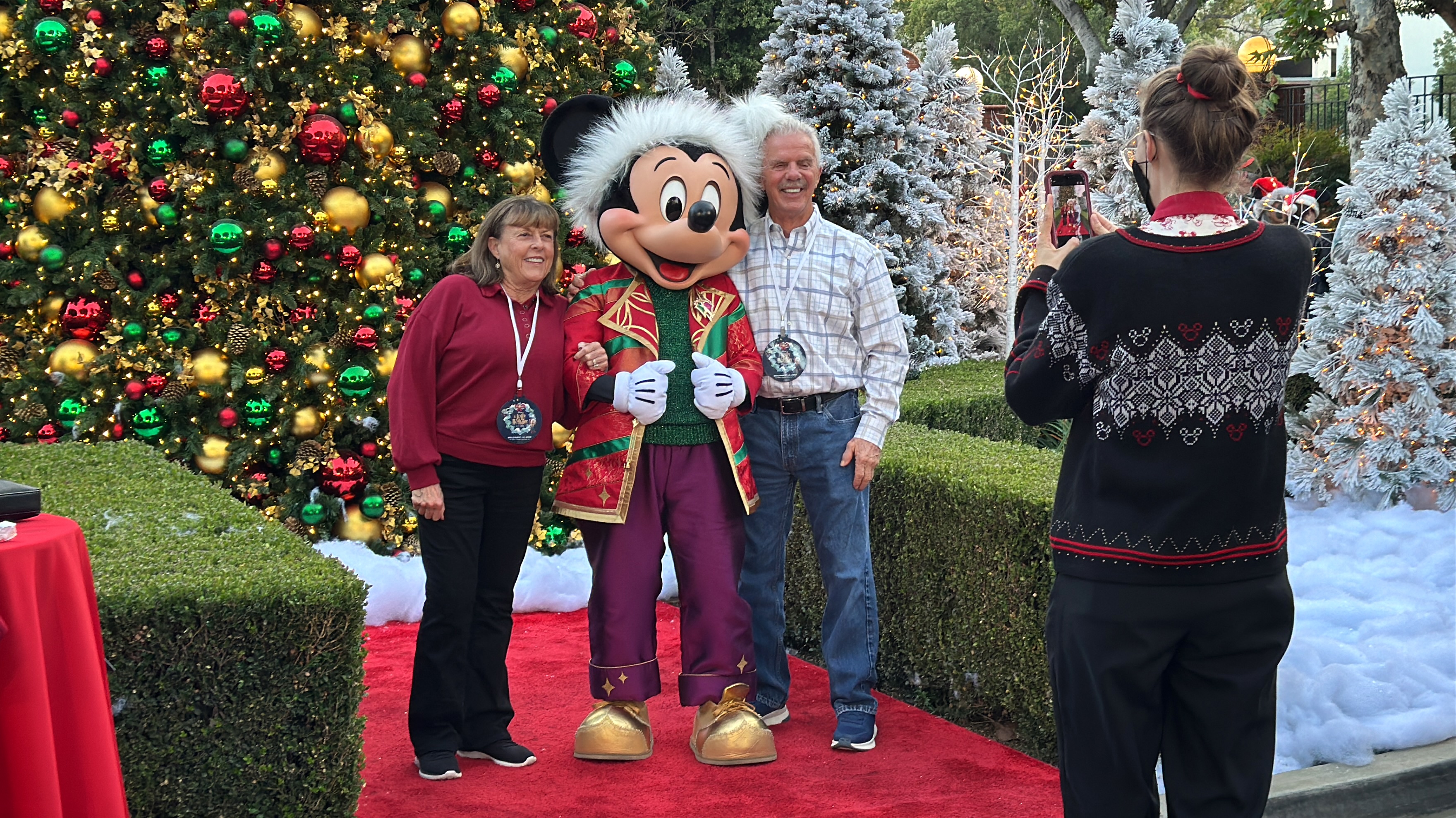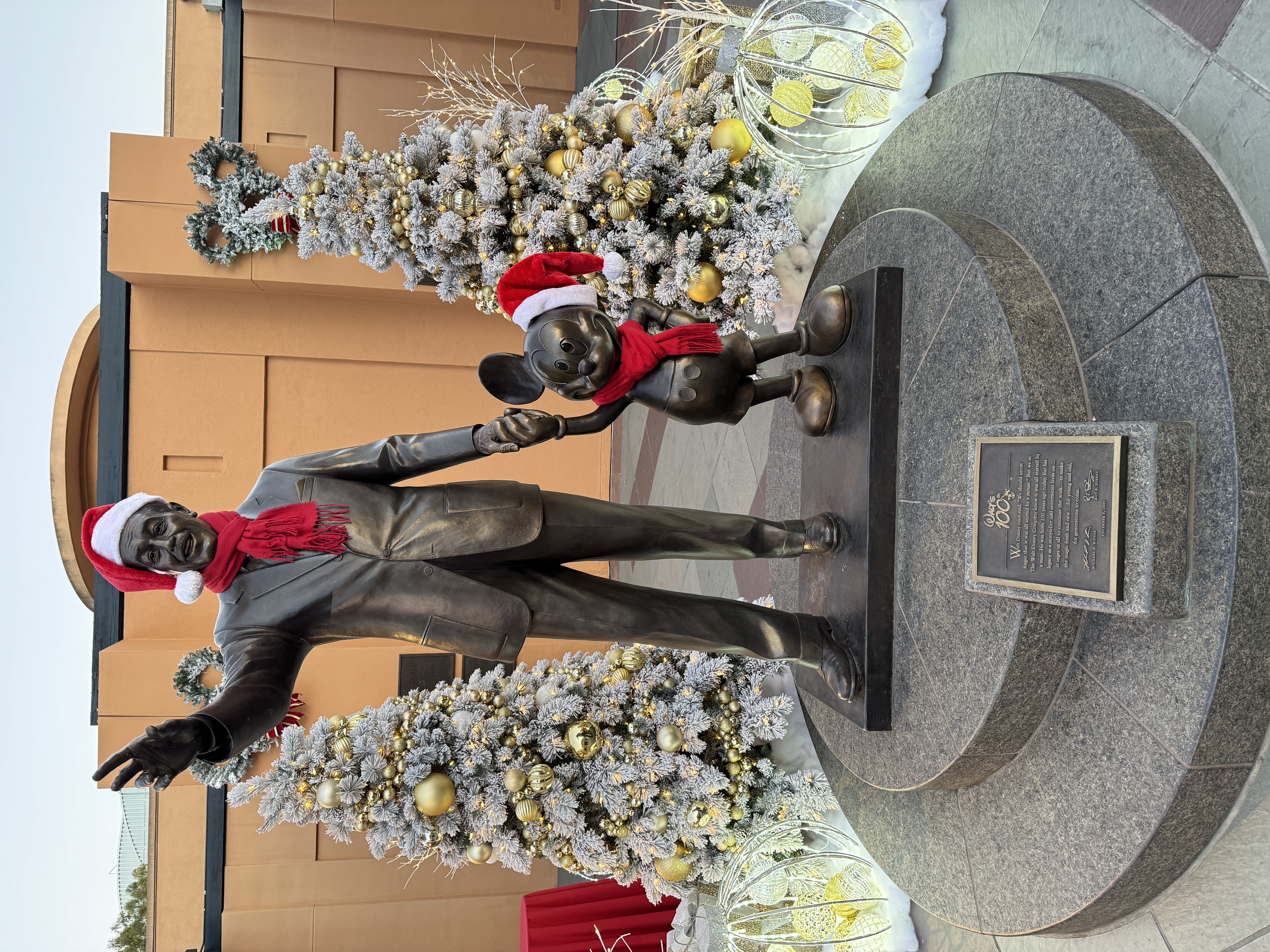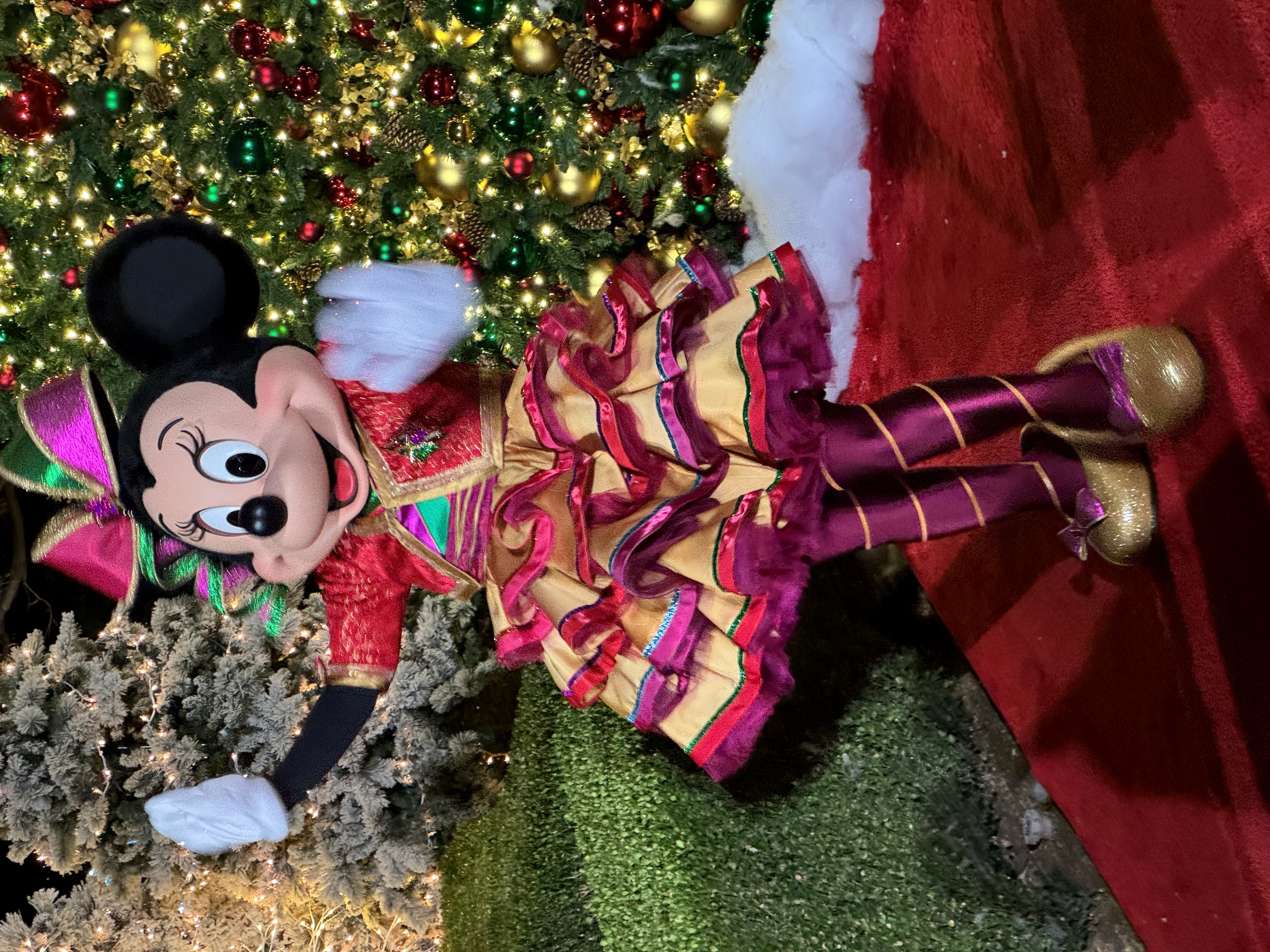 Posing underneath the lot's big Christmas tree was Mickey Mouse, all dressed up for the occasion in appropriate reds and greens.