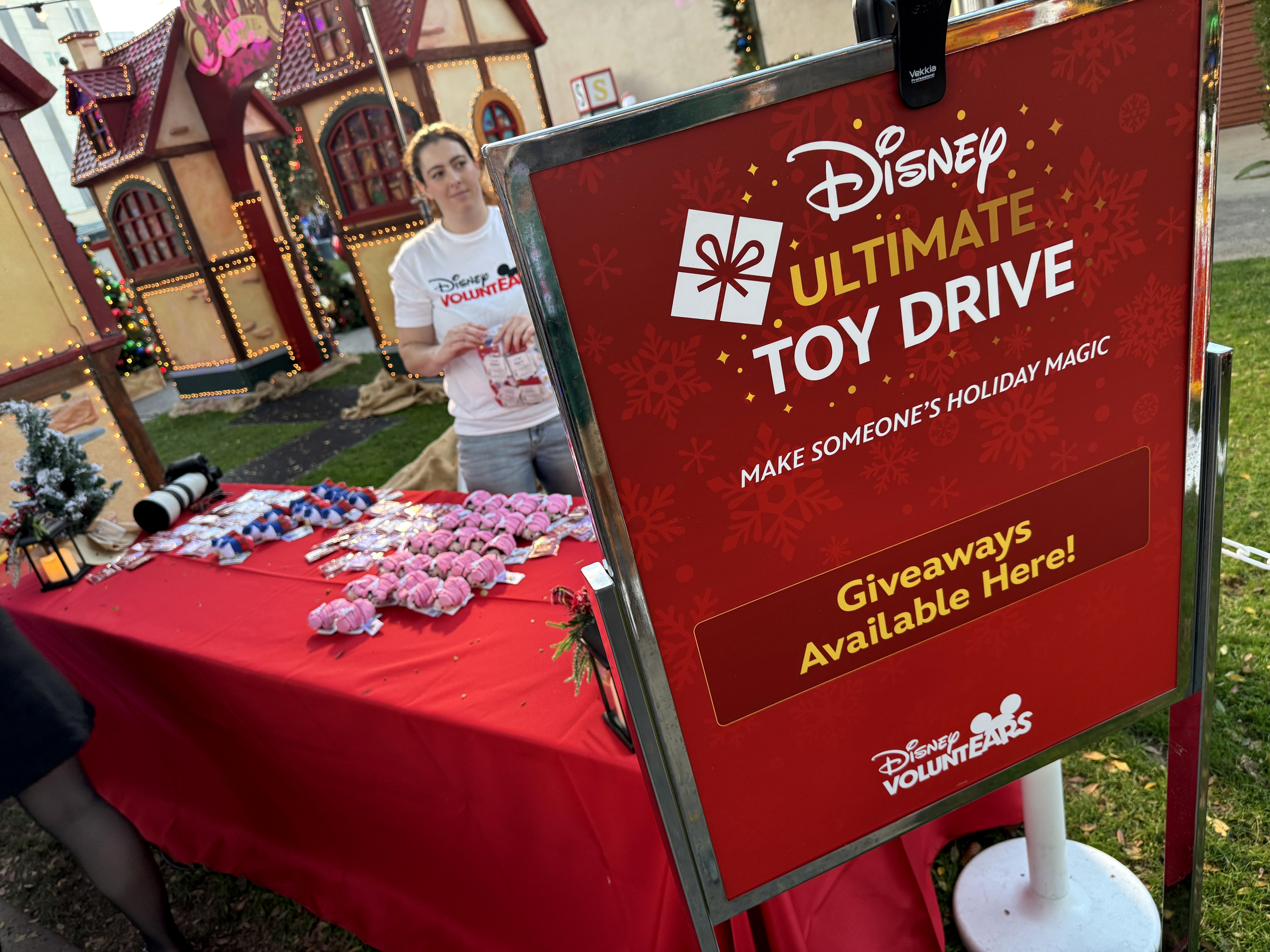 Here's a look at another backdrop photo op that doubled as a performance stage, a box for the Disney Ultimate Toy Drive presented in partnership with Toys for Tots, and a row of carnival-style games available to guests.