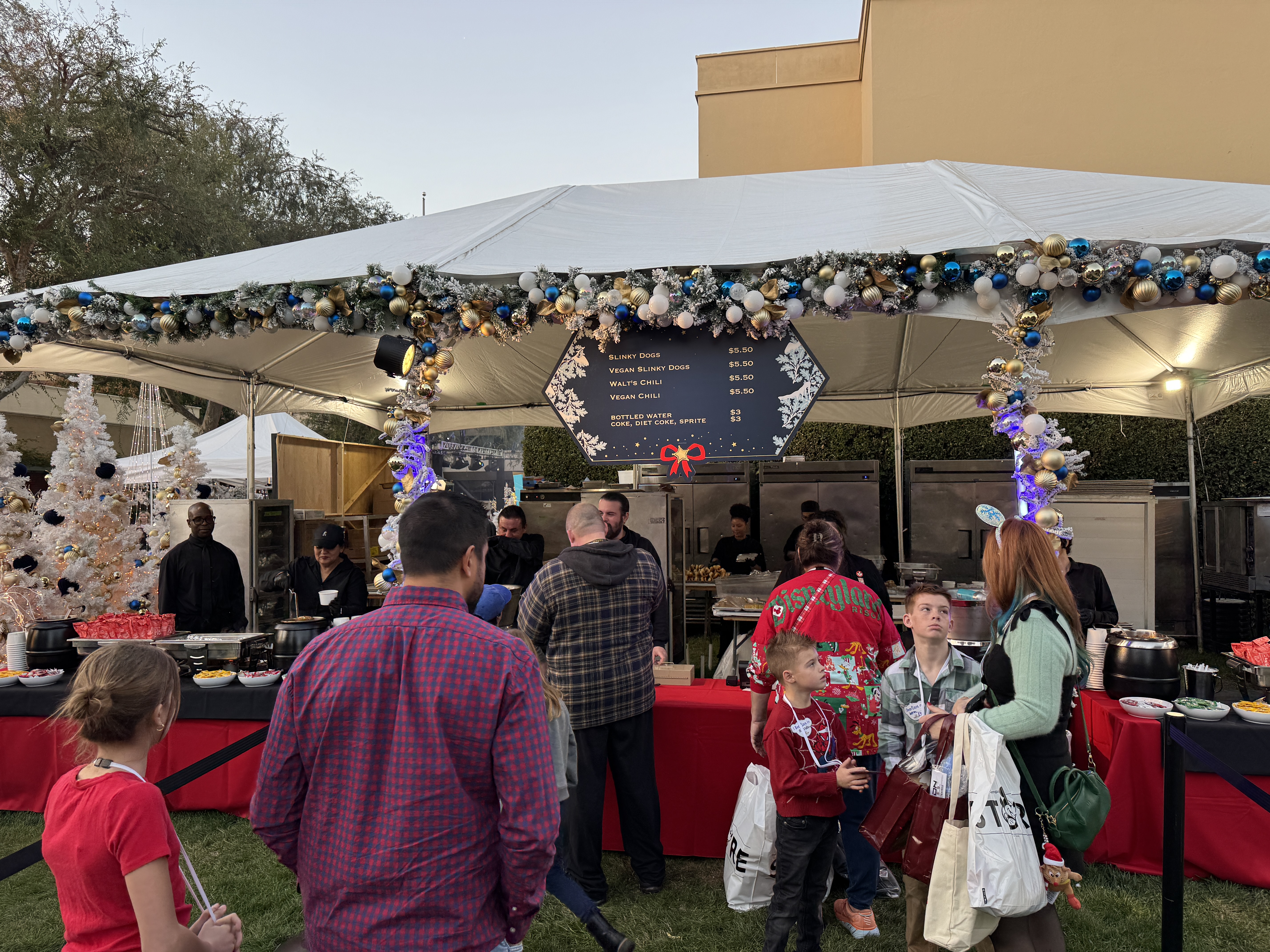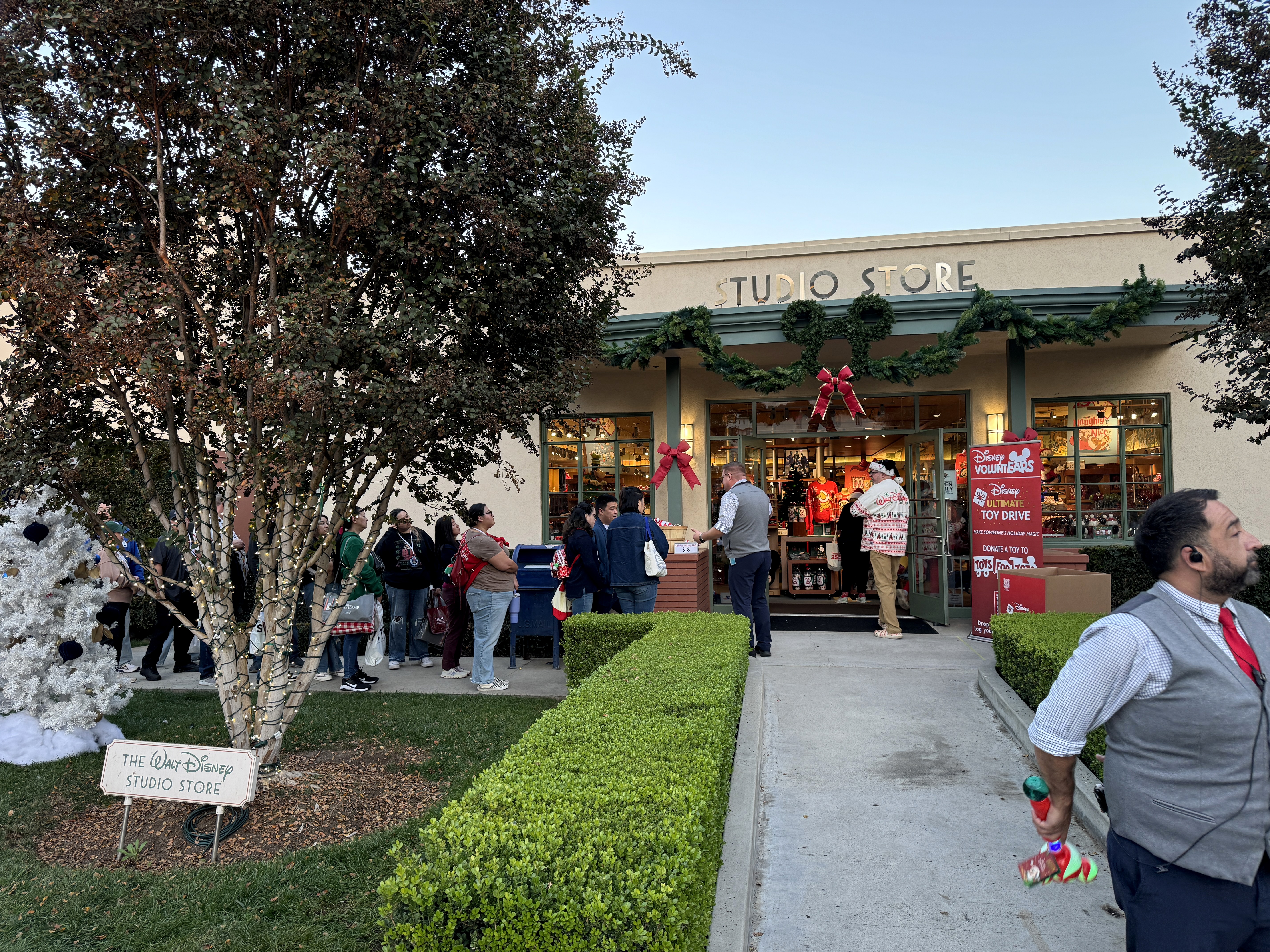 Guests could also line up to enter the main Studio Store building, and there were food kiosks, booths, and stands for items like apple cider, cotton candy, popcorn, and hot cocoa, many of which were included with admission. A host on the main stage moderated Disney-themed trivia challenges with various prizes, and other wintertime holidays beyond Christmas were represented in the decor, such as Hanukkah and Kwanzaa.