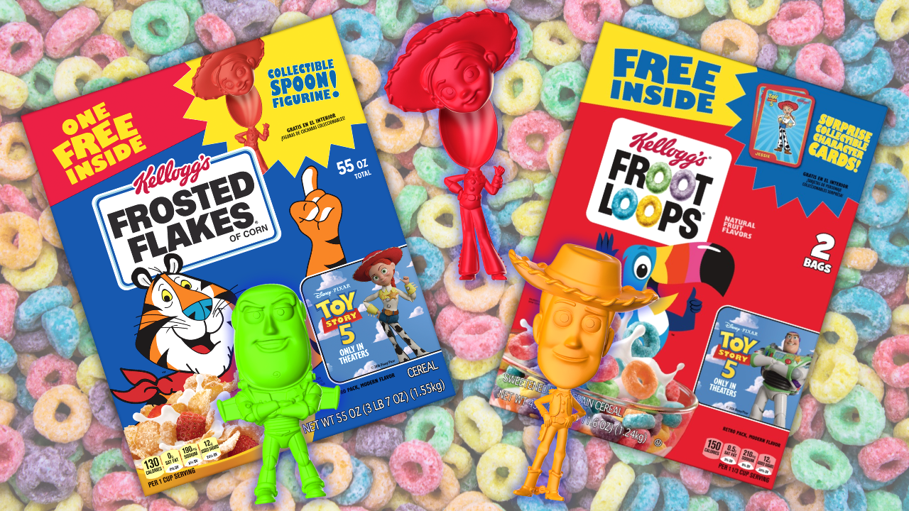 - Toy Story 5-branded boxes of Froot Loops, Frosted Flakes, Corn Pops, Apple Jacks, Frosted Mini-Wheats, Rice Krispies, Corn Flakes, and Cocoa Loops will feature playable toys inside the box. These include spoons, trading cards, and movie ticket promotions.