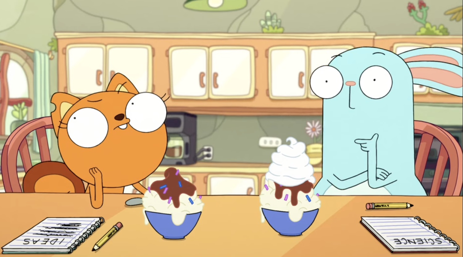At the Buns household, Kiff and Barry are eating ice cream and trying to figure out what to do for their science fair project, getting all the bad ideas out first - like “how long does a candle burn?" Barry is seized with inspiration and comes up with an idea for a helmet that prevents brain freeze when you eat ice cream. It’s a genius idea, and it will surely get them that second place spot.
