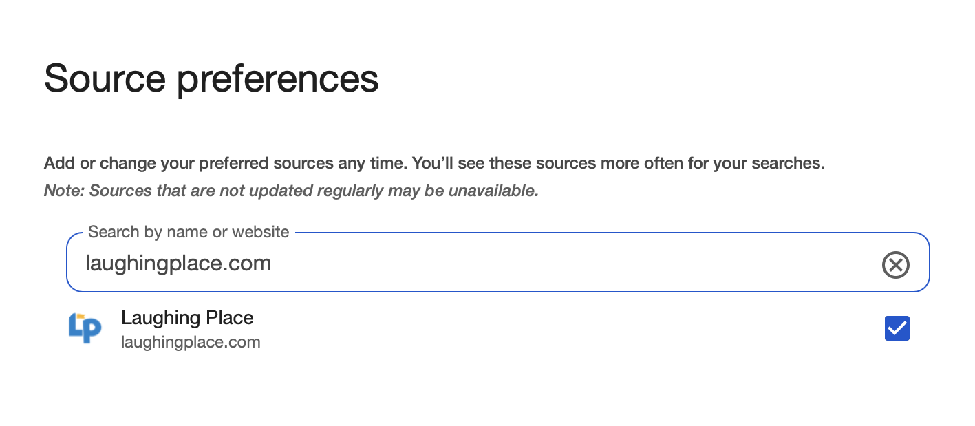 After you click the “Reload results” button, your refreshed search results should include the latest content from LaughingPlace.com. From then on, you'll get all the latest Laughing Place has to offer more prominently in Top Stories or within the “From your sources” section.