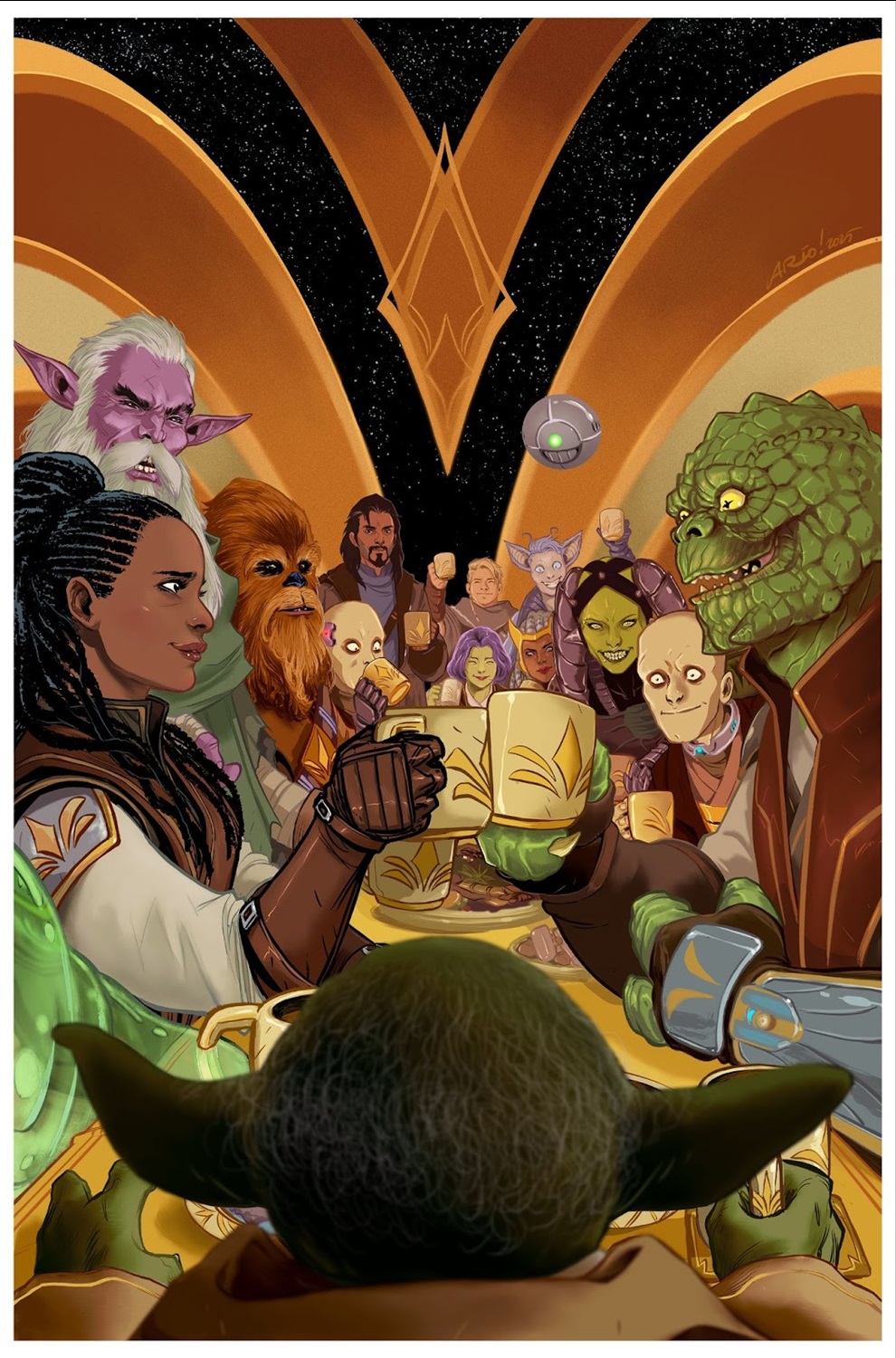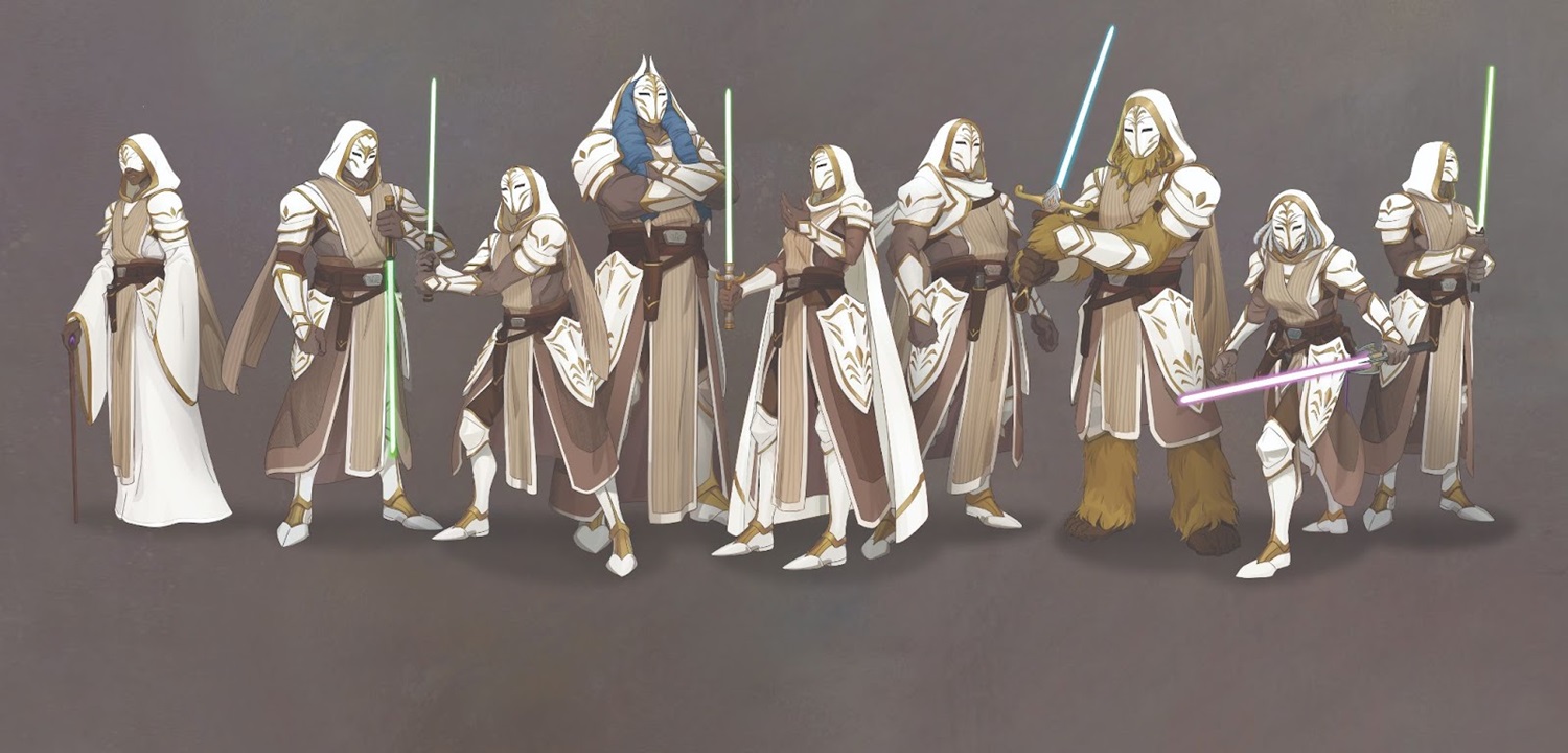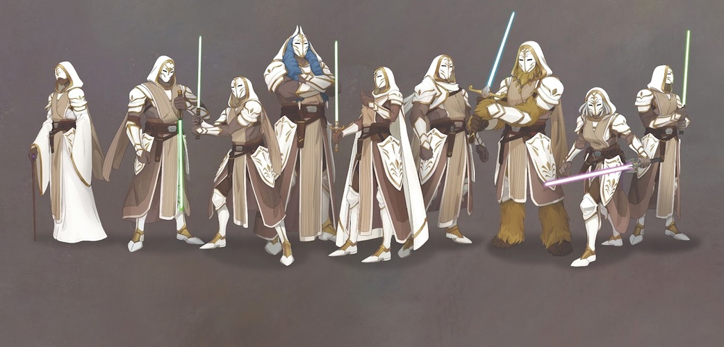 “Everything now depends on nine brave Jedi, led by Avar Kriss and Elzar Mann, who embark on a treacherous journey to the Nameless homeworld. Their quest: to finally solve the mystery of the Nameless and their connection to the Force, and to stop the blight before its damage becomes irreversible. But a final confrontation with Marchion Ro awaits. Ro, who is willing to sacrifice everything he’s achieved to secure a final victory against the Jedi and carve his name into the very stars for all time. Nothing less than the fate of everything, perhaps even the Force itself, is at stake." Below take a look at the “Luminous Nine" concept art by Minji Yoon, which includes the Jedi (or former Jedi) characters of Azlin Rell, Bell Zettifar, Reath Silas, Torban Buck, Avar Kriss, Elzar Mann, Burryaga, Ty Yorrick, and Terec.