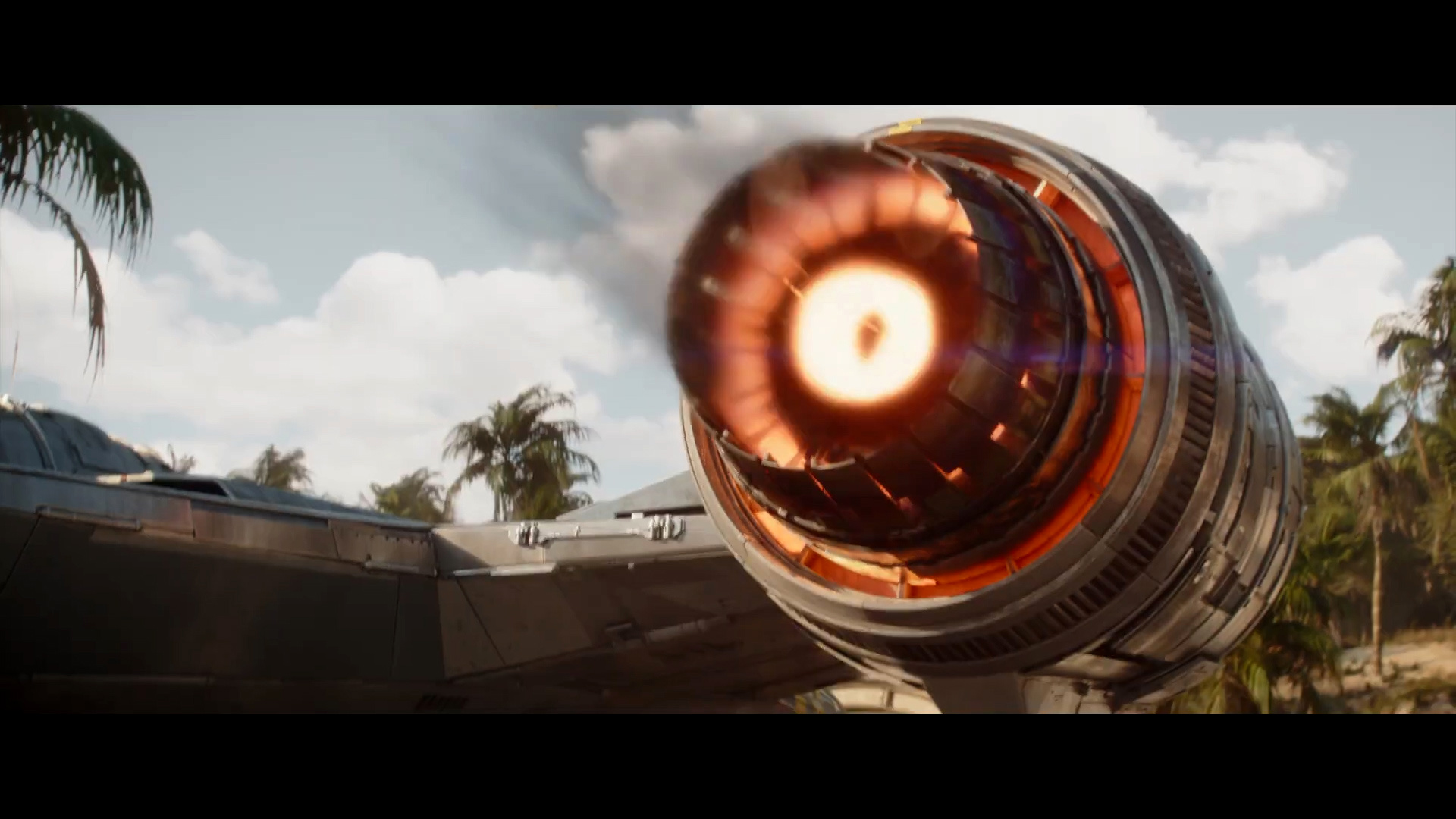 - Shot #50 - Something explodes in the sky ahead of us as the camera, attached to the side of the Razor Crest, flies through the explosion.