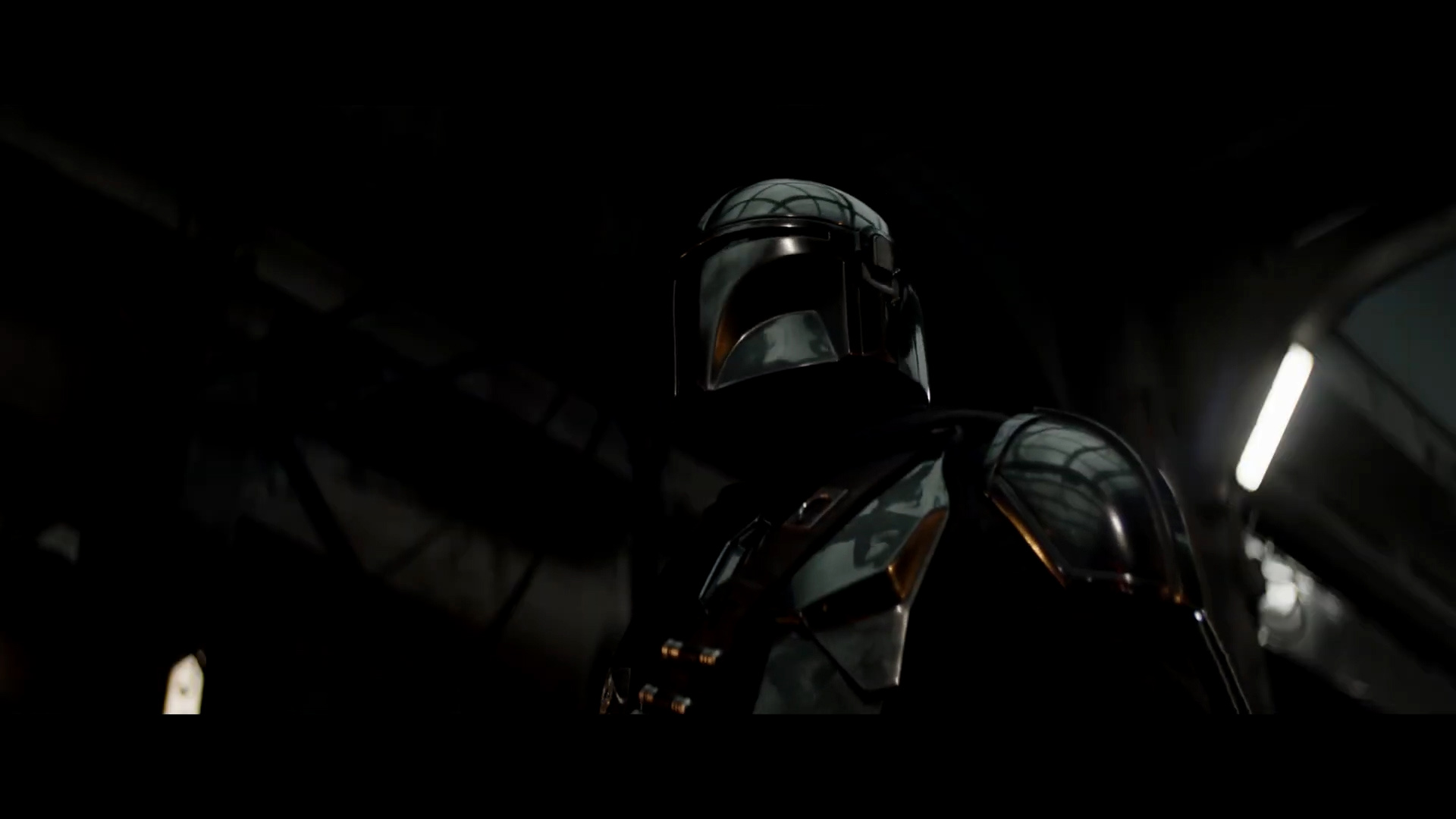 - Shot #3 is a close-up of a control panel inside the Razor Crest cockpit as Din Djarin's (AKA The Mandalorian, AKA Mando) gauntleted hand presses buttons.