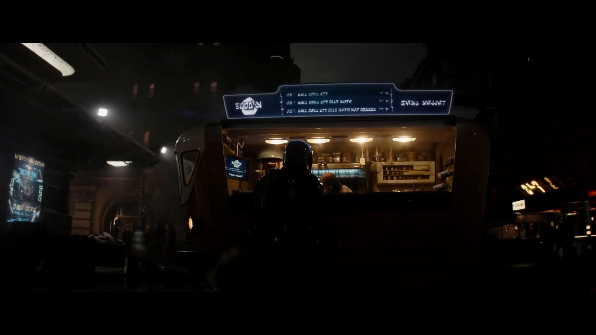 - Shot #15 - Mando approaches what looks like a mobile food stall on this city planet.