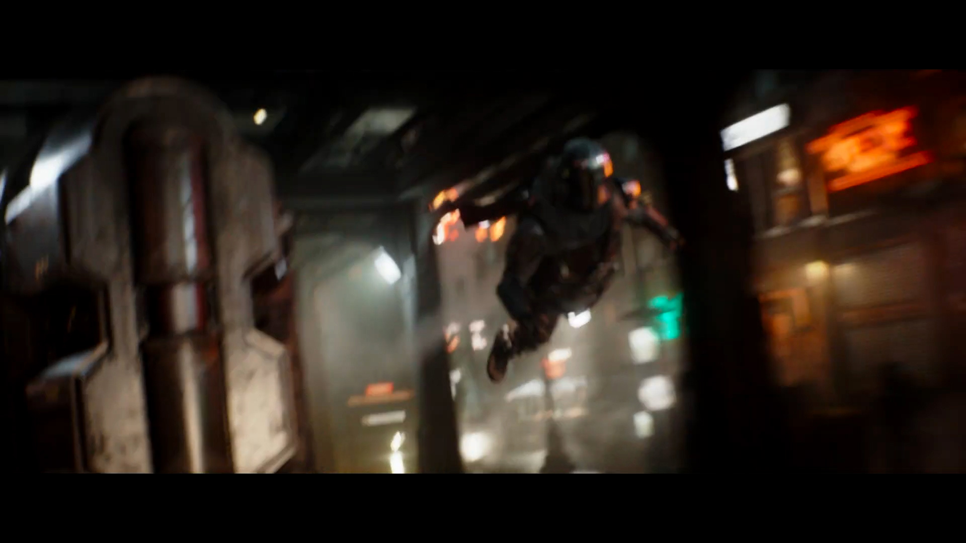 - Shot #84 - More of Mando flying through the seedy cityscape.