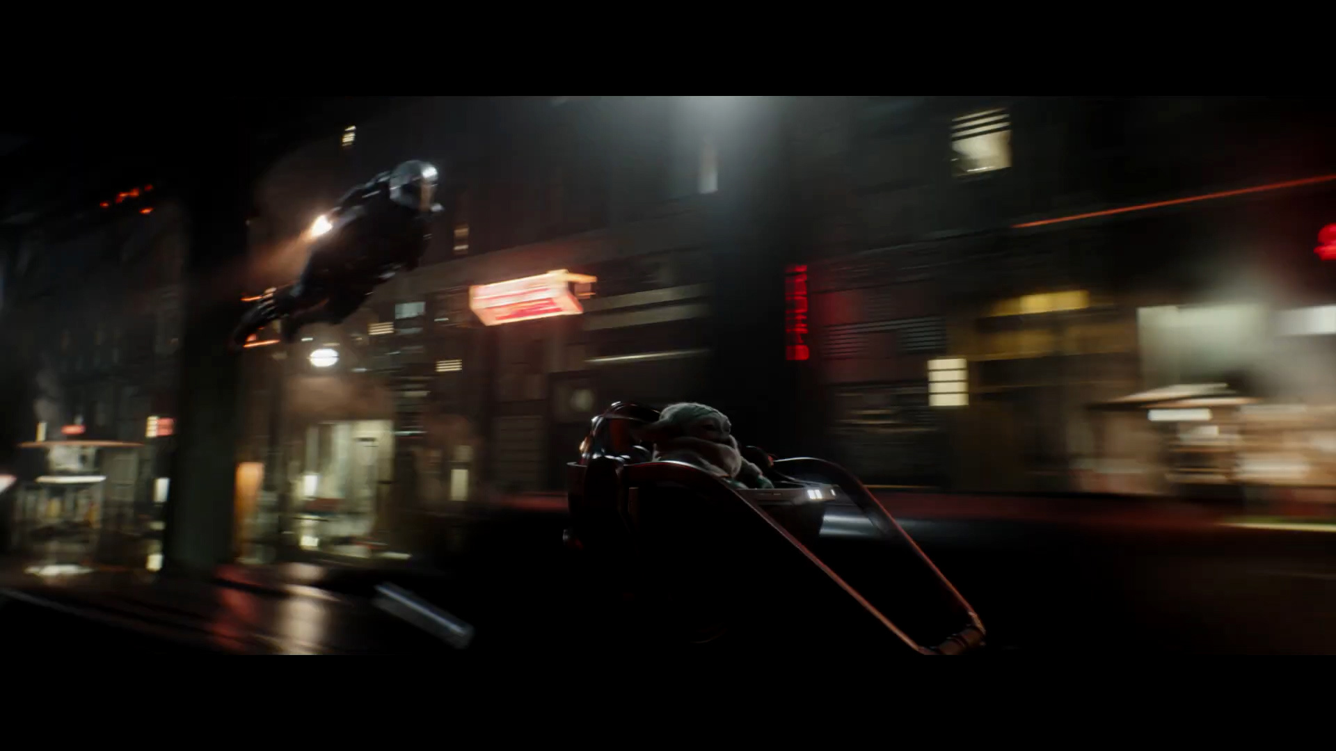 - Shot #85 - We watch from the side, following as Mando and Grogu zoom along the city streets together.