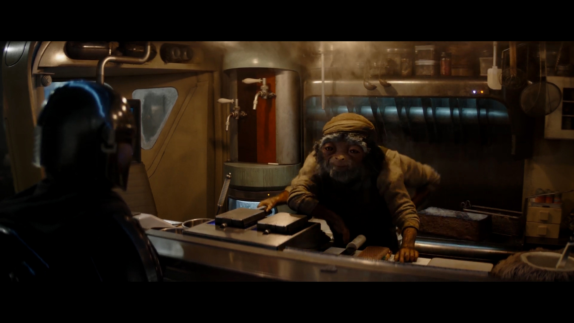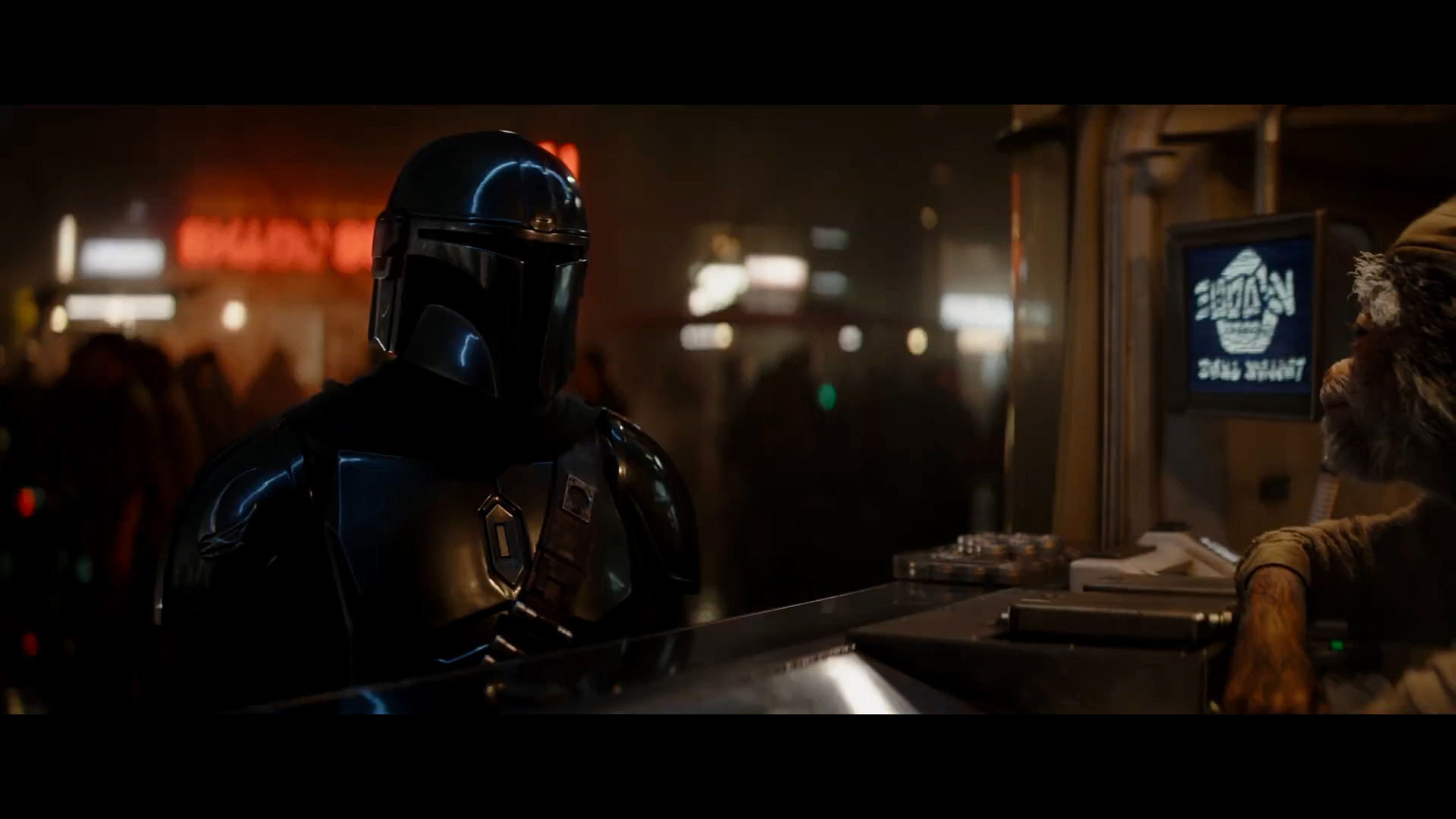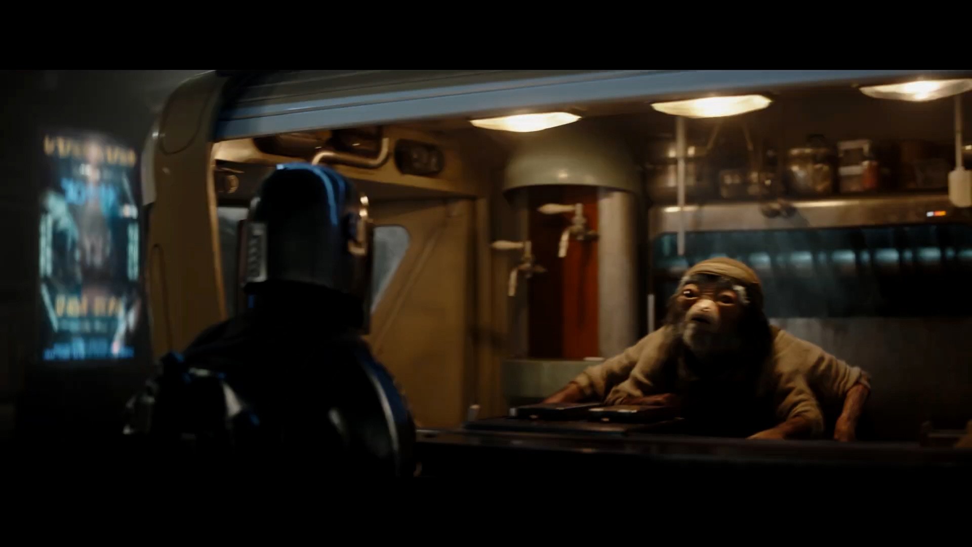 - Shot #18 - Mando responds. The LED sign above the counter once again reads "Hugo's - Best Seller." The red Aurebesh sign in the background behind Din's helmet is too out-of-focus to read.