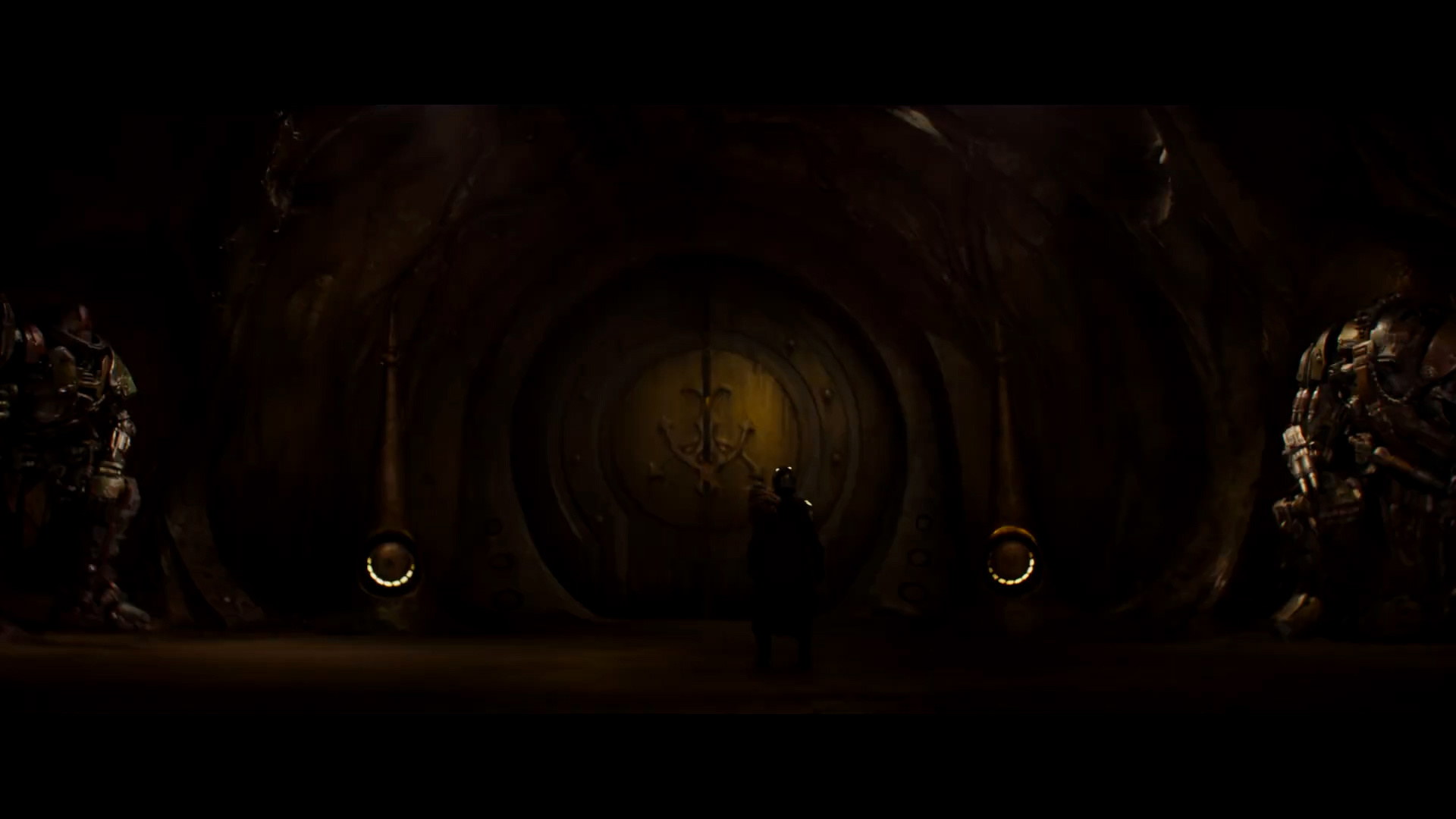 - Shot #20 - Mando stands in front of a large door with the Hutt Cartel insignia on it. Two enormous, heavily armed (perhaps droids) guards stand to either side of the door as it begins to open.