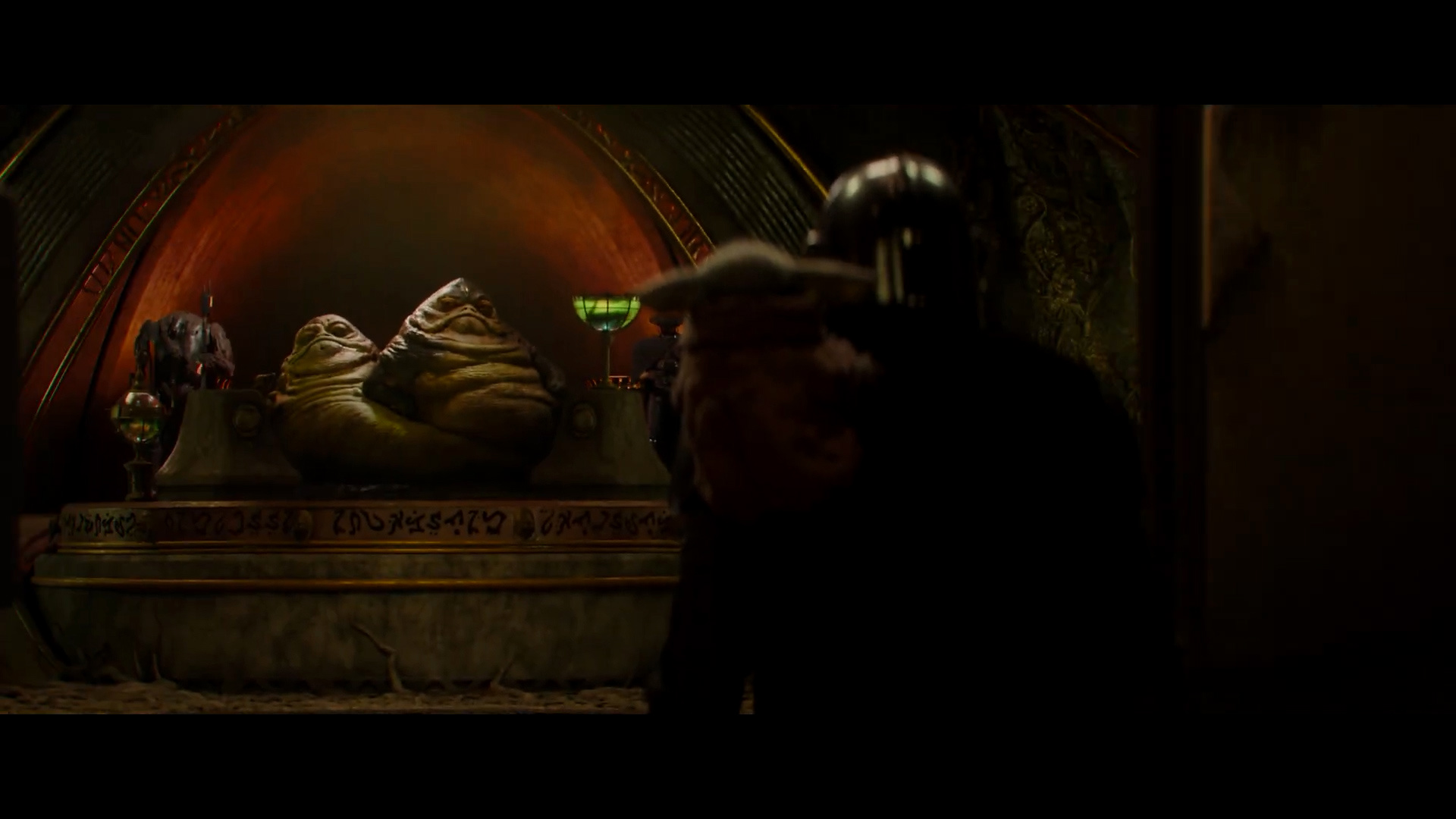 - Shot #21 - From behind Mando (with Grogu perched on his shoulder), the doors open to reveal the Hutt Twins from The Book of Boba Fett on their dais. We don't know these characters' names just yet, but hopefully they will be revealed in the film.