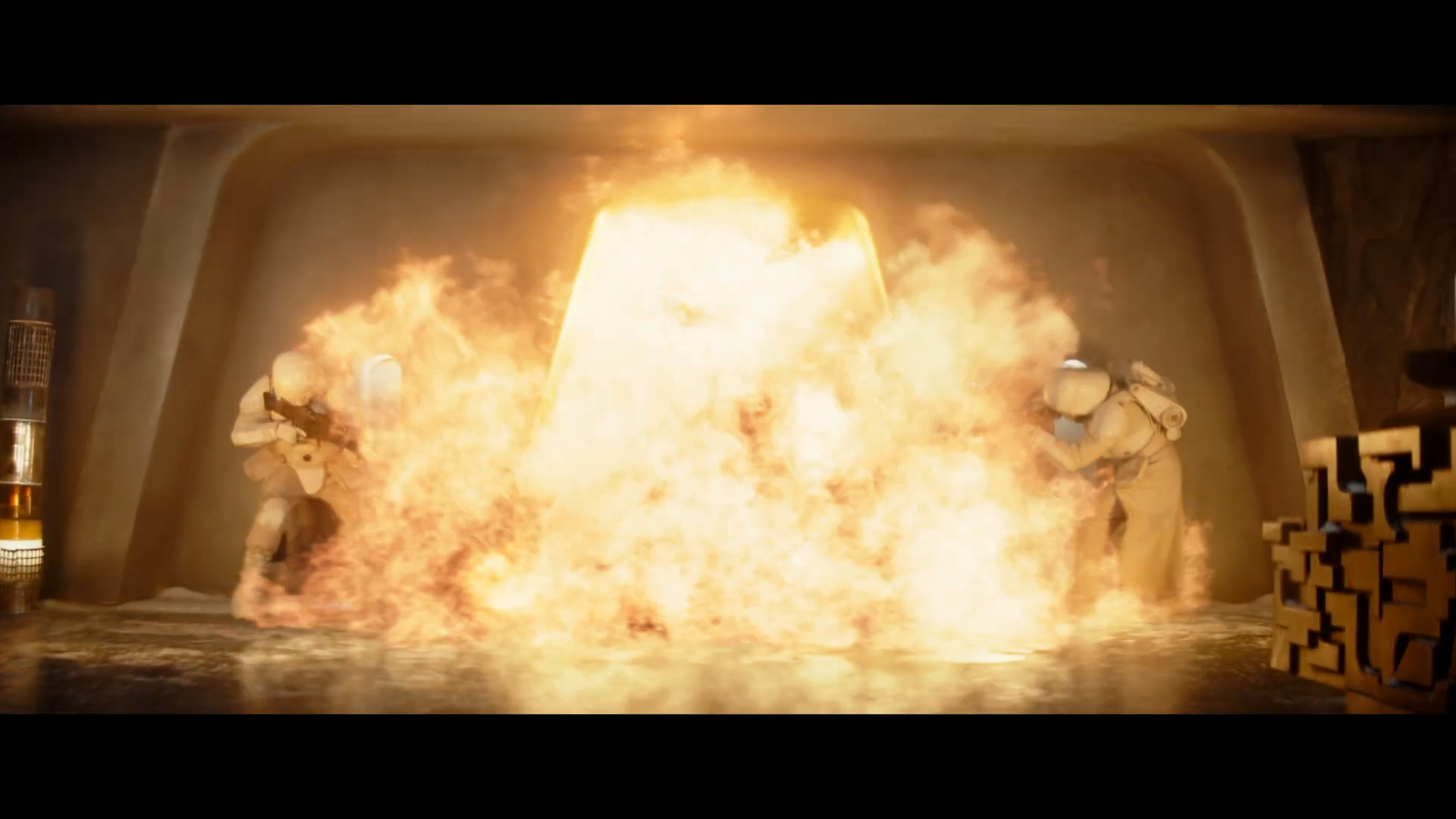 - Shot #27 - Presumably at the same Imperial remnant base we saw above, we see the Mandalorian enter with a burst of flame and then take out two snowtroopers with his blaster, double-tapping the second one. I'm not sure what that object is on the right.