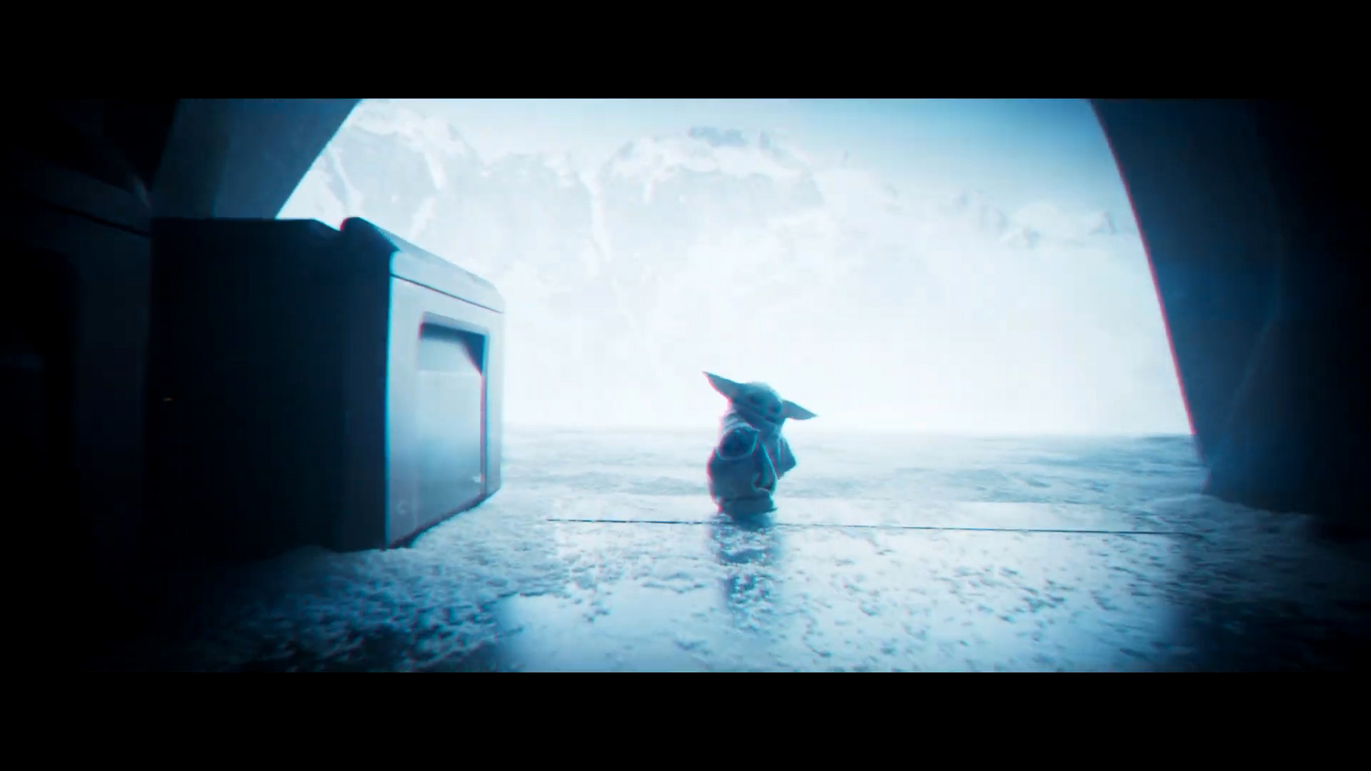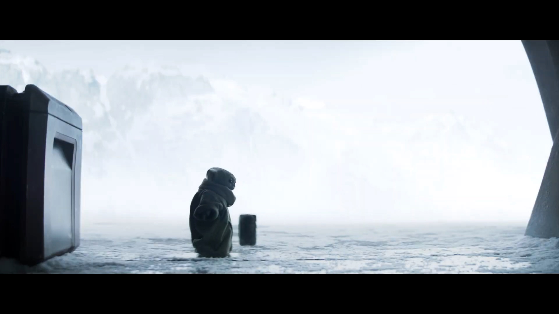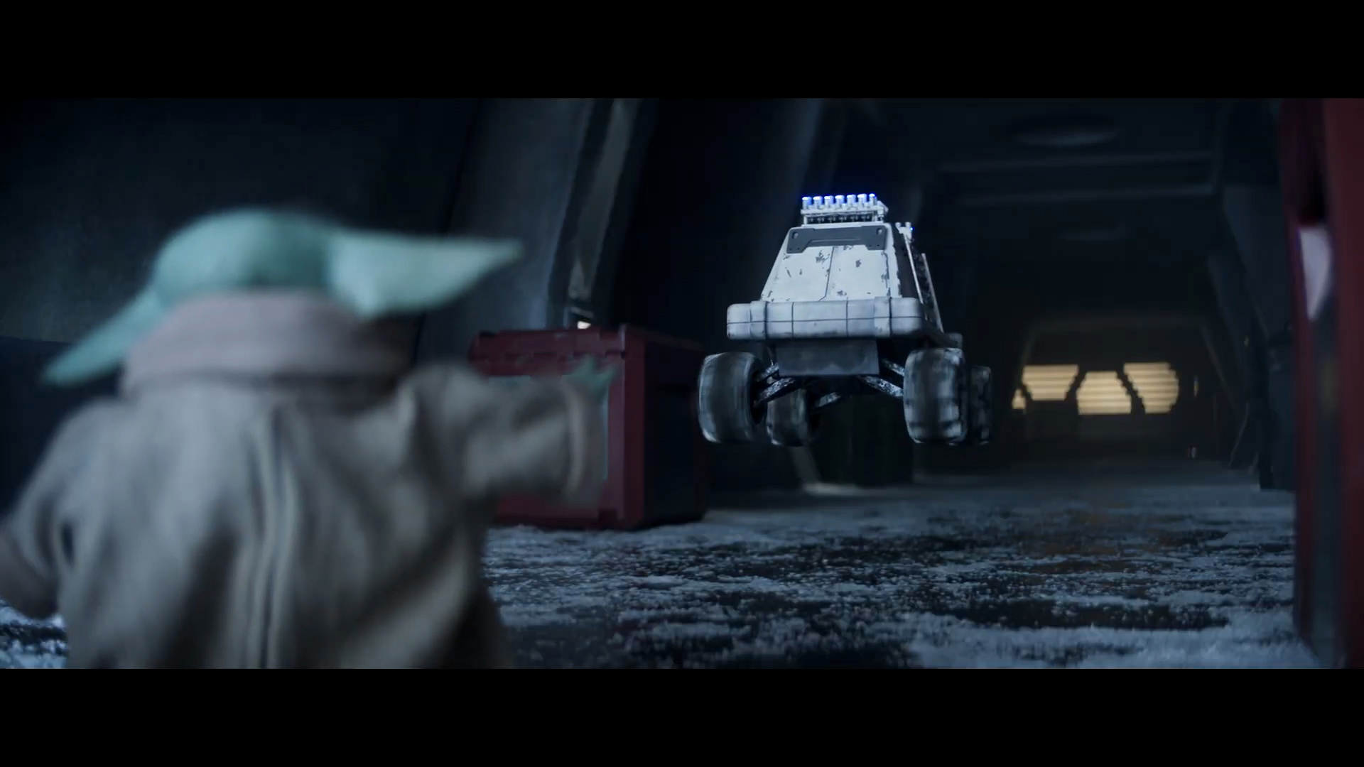 - Shot #30 - At the icy Imperial base, the camera dollies in as Grogu jumps out from behind some crates.