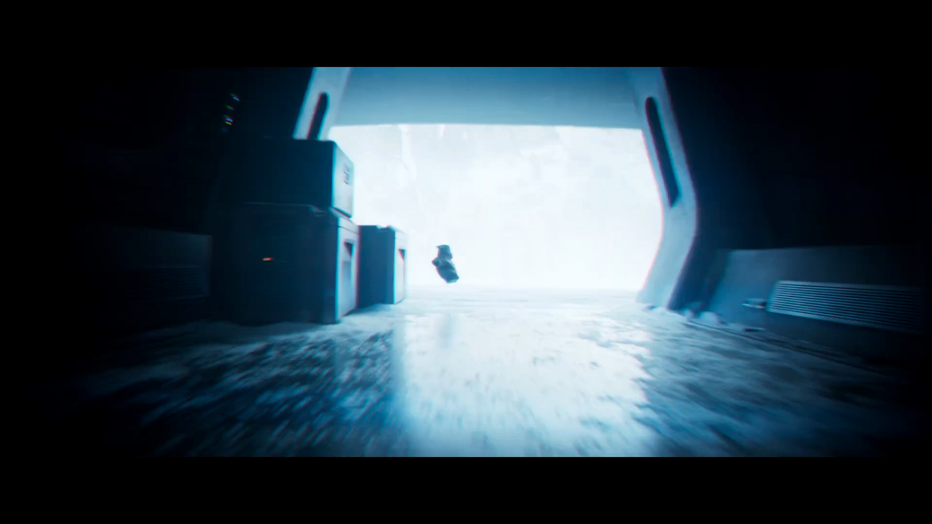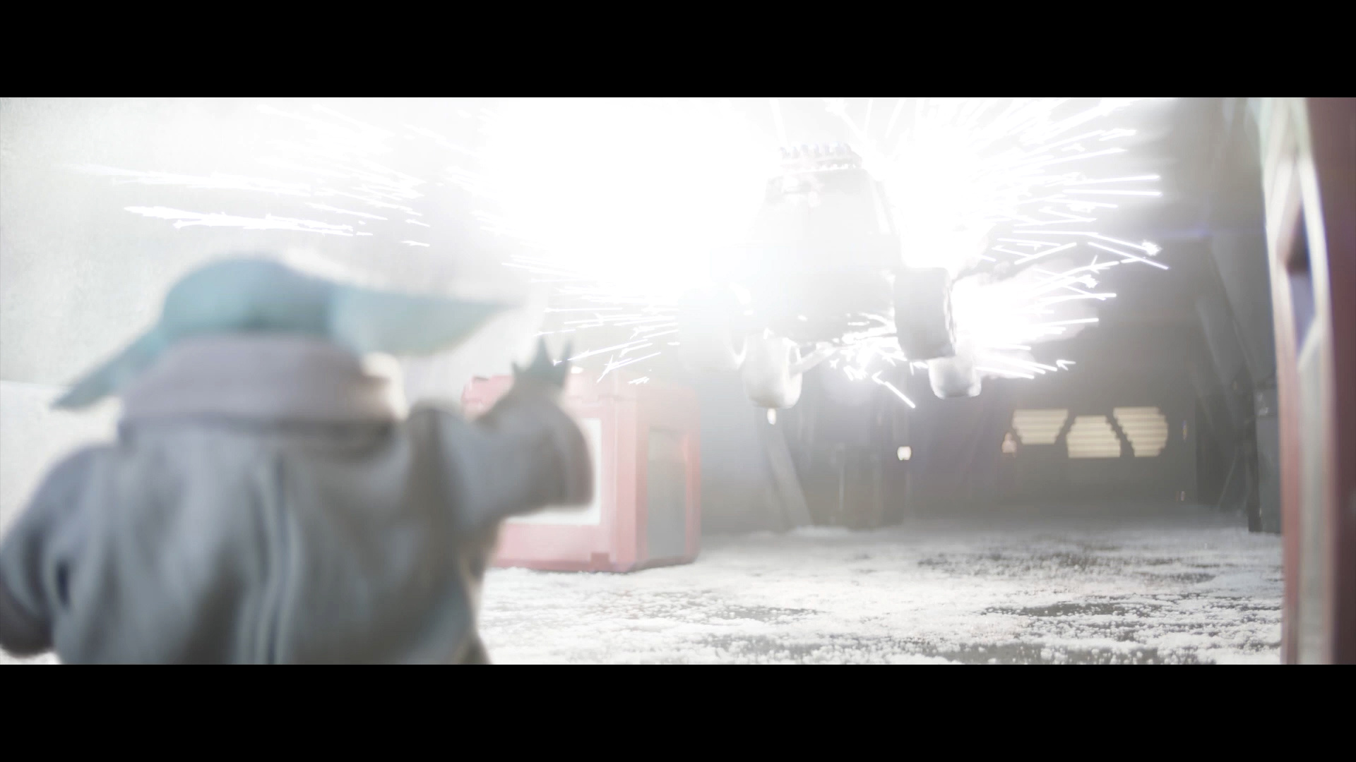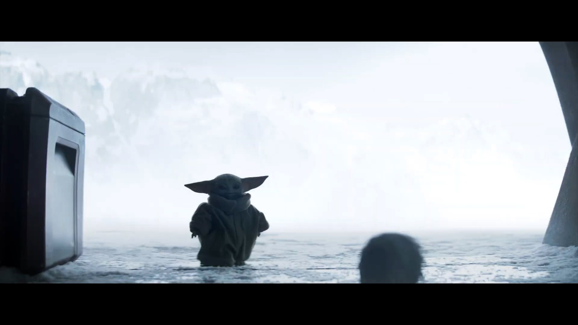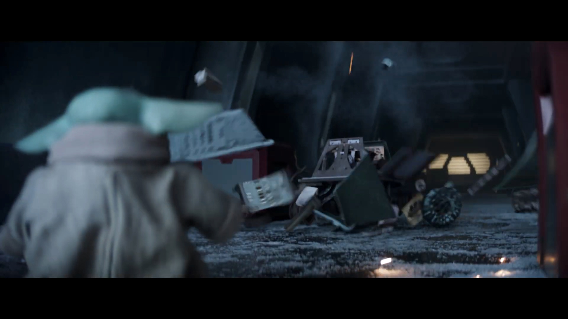 - Shot #30 - At the icy Imperial base, the camera dollies in as Grogu jumps out from behind some crates.