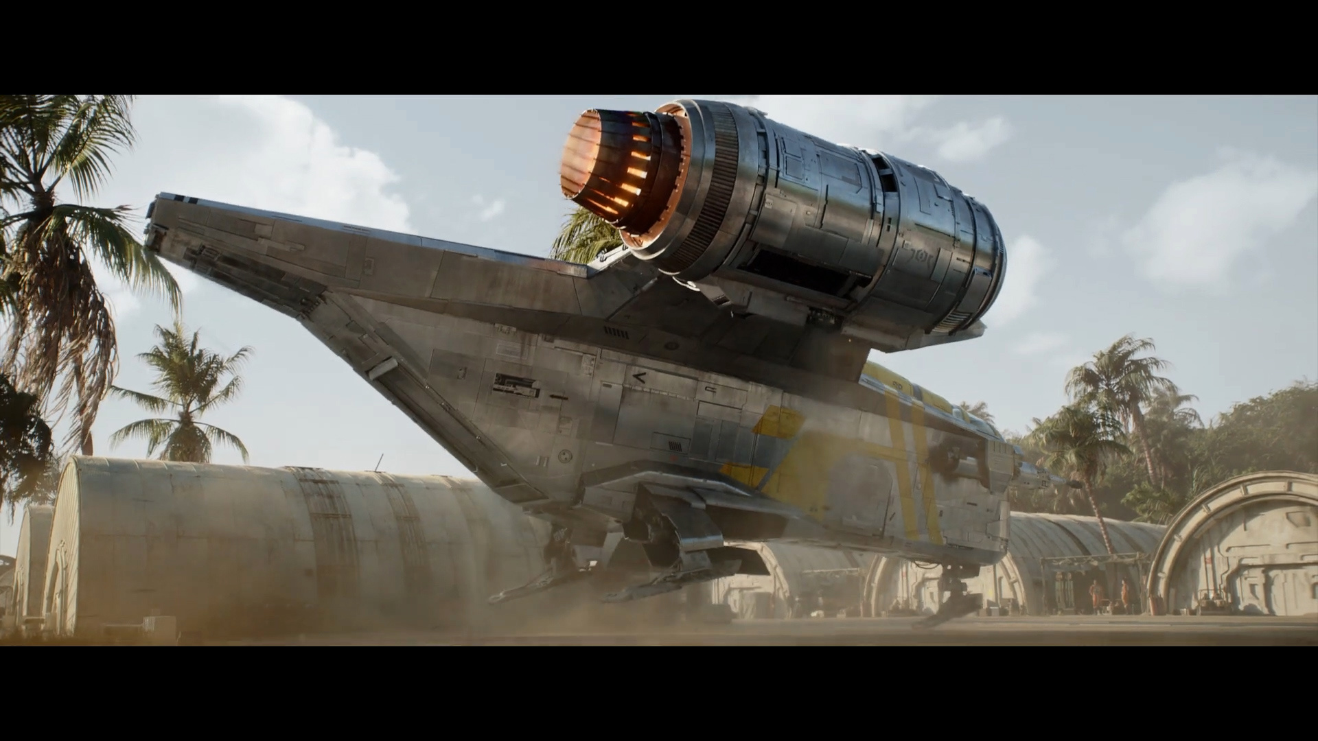 - Shot #6 - Against the palm trees of Adelphi Base in the background, we see one of the Razor Crest's engines fire up and then burn out. I should note that while Din Djarin's first Razor Crest ship was destroyed by the Imperial remnant in season 2 of The Mandalorian, it seems as though he has acquired a new ship of the same model. In-between, as established in The Book of Boba Fett, he and Grogu were using a souped-up Naboo N-1 starfighter, but it would be difficult to fit bounties inside of that ship.