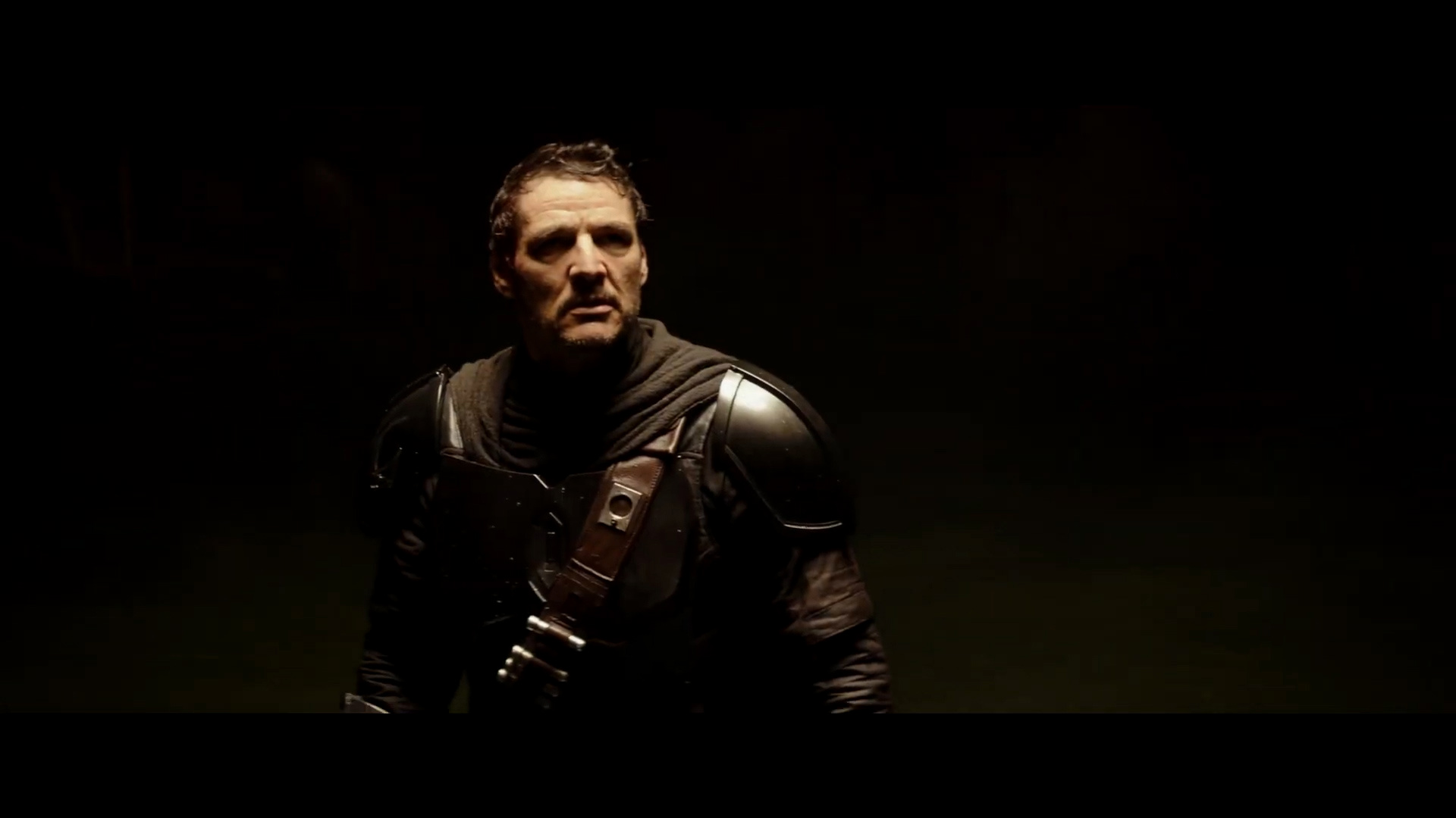- Shot #42 - A hand belonging to one of the droid soldiers removes the helmet from Din Djarin's head, revealing Pedro Pascal's face. Mando appears to be kneeling in this shot, likely having been captured and restrained. He does not look happy.