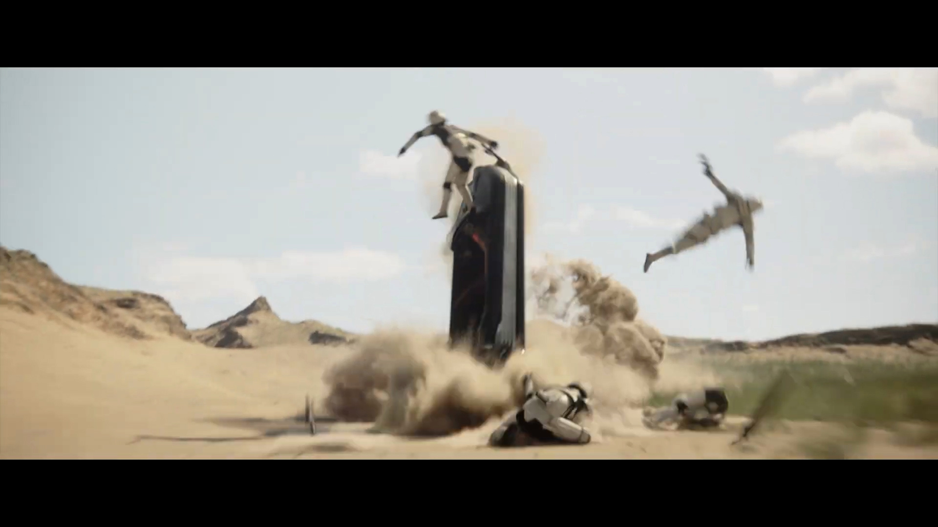 - Shot #67 - A speeder carrying four stormtroopers flips over after a blaster shot rings out, sending the troopers flying. The planet looks arid and rocky, though there is some grass as well. Hard to say where this might be.