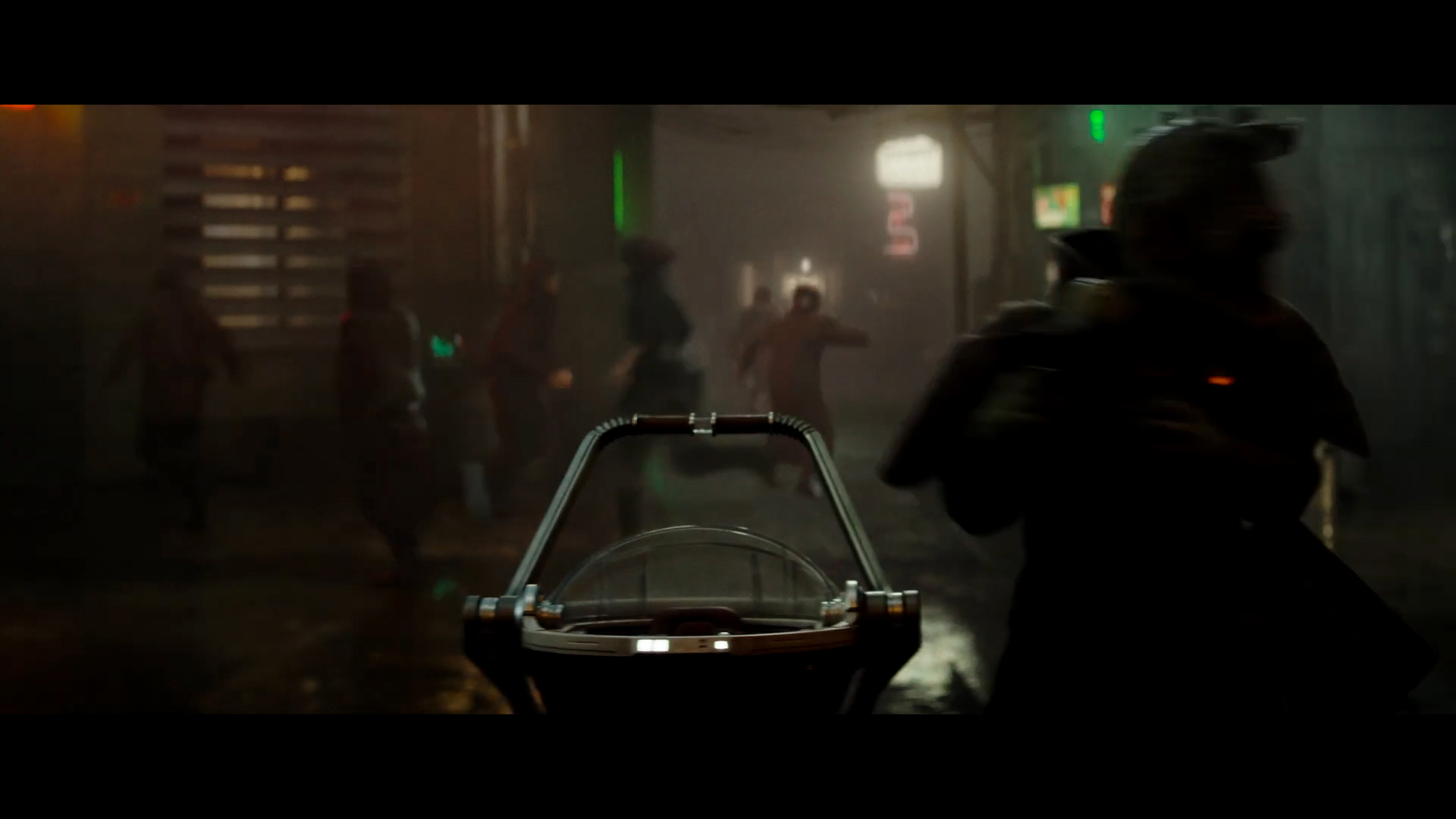 - Shot #73 - The Rodian's mom grabs the baby and flees, leaving the hover-pram unattended as other aliens run panicked in the background.