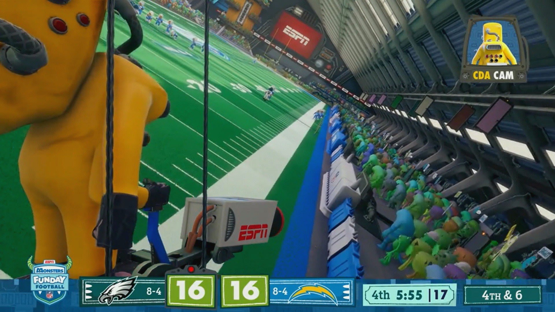 Monday night’s alt-cast of the Los Angeles Chargers and the Philadelphia Eagles football game brought the NFL action to Monstropolis, with ESPN’s Drew Carter and Dan Orlovsky transformed into monster broadcasters. Cheer canisters lined the field as fans powered them up with their cheers, echoing the Monsters, Inc. energy system and feeling a bit like the Laugh Floor at Magic Kingdom.