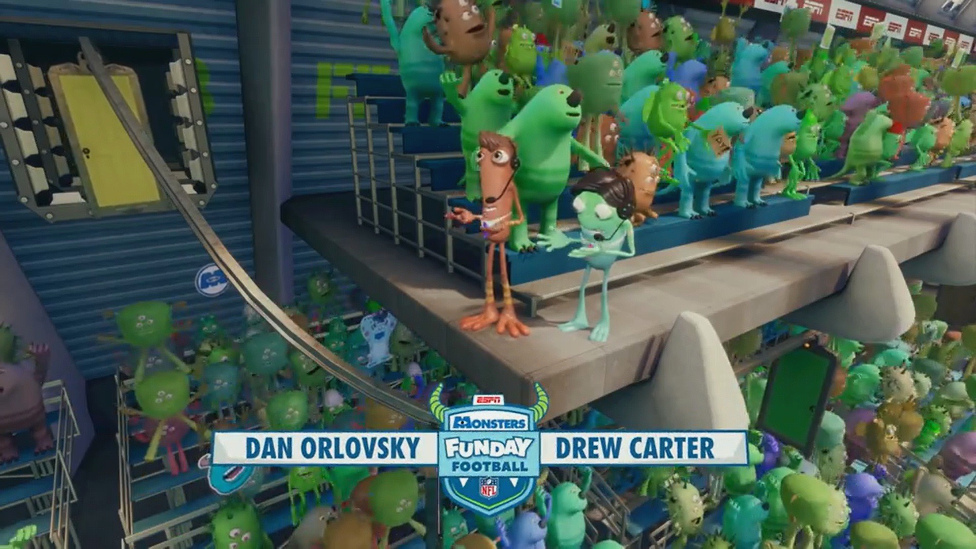 The broadcast used halftime for lots more Monsters fun, unveiling a Mike vs. Sulley Cheer Canister Challenge. After Orlovsky jokingly scolded the crowd’s lack of energy and prompted them to “Roar,” the three-event contest played out like a Monsters Inc. mini-festival. Mike found a clever way to win the opening ball toss; Sulley claimed the High Striker after Mike’s comedic miscalculation; and tug-of-war became the deciding showdown.