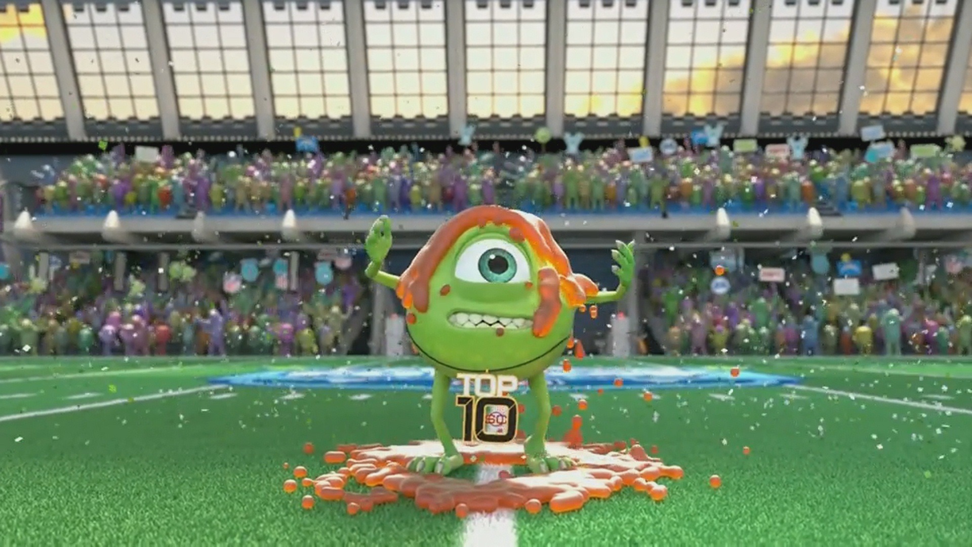 The broadcast used halftime for lots more Monsters fun, unveiling a Mike vs. Sulley Cheer Canister Challenge. After Orlovsky jokingly scolded the crowd’s lack of energy and prompted them to “Roar,” the three-event contest played out like a Monsters Inc. mini-festival. Mike found a clever way to win the opening ball toss; Sulley claimed the High Striker after Mike’s comedic miscalculation; and tug-of-war became the deciding showdown.