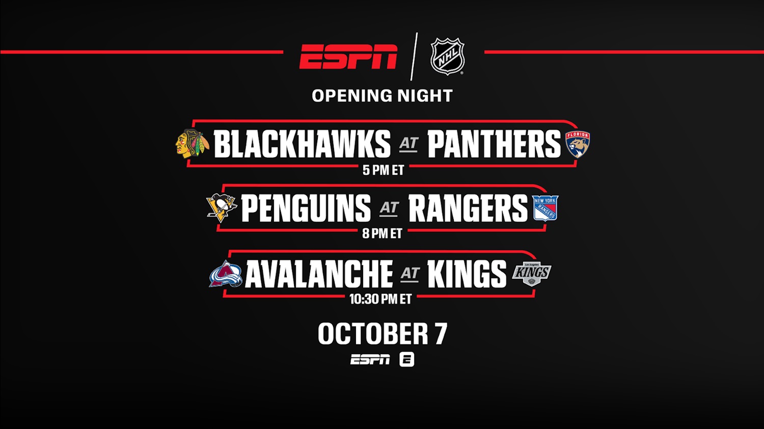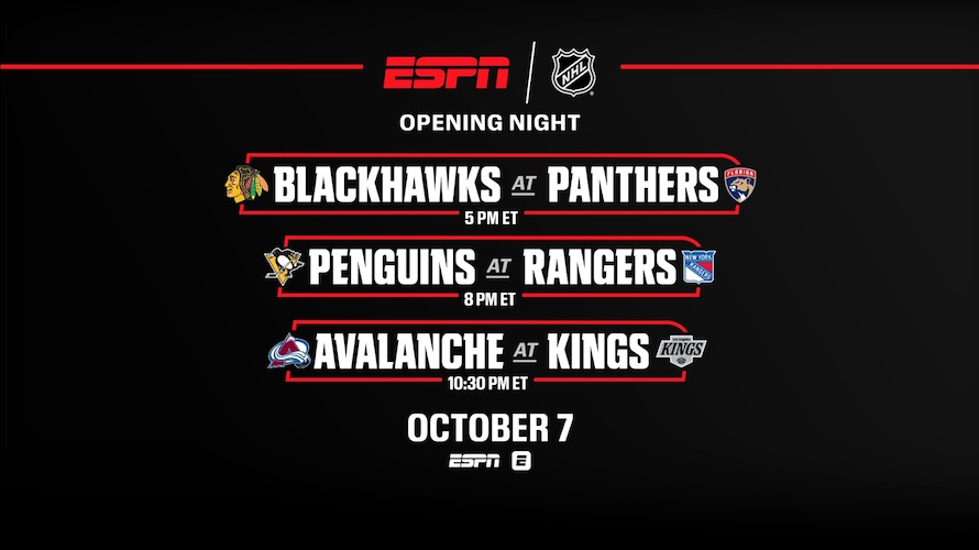 - The season kicks off on Tuesday, October 7, with three exciting matchups on ESPN. The defending Stanley Cup champion Florida Panthers will raise their banner before taking on the Chicago Blackhawks at 5 p.m. ET. The night continues with the Pittsburgh Penguins facing the New York Rangers at 8 p.m. ET, and the Colorado Avalanche battling the Los Angeles Kings at 10:30 p.m. ET.