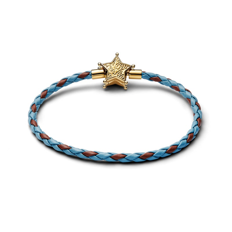 At the center of the collection is a bracelet chain inspired by Sheriff Woody himself. The design features blue and brown leather accented by an embossed sheriff star charm plated in 14k gold, a direct nod to Woody’s iconic badge and his role as the loyal leader of Andy’s toys. It’s both a statement piece and a subtle tribute to one of Disney and Pixar’s most enduring characters.