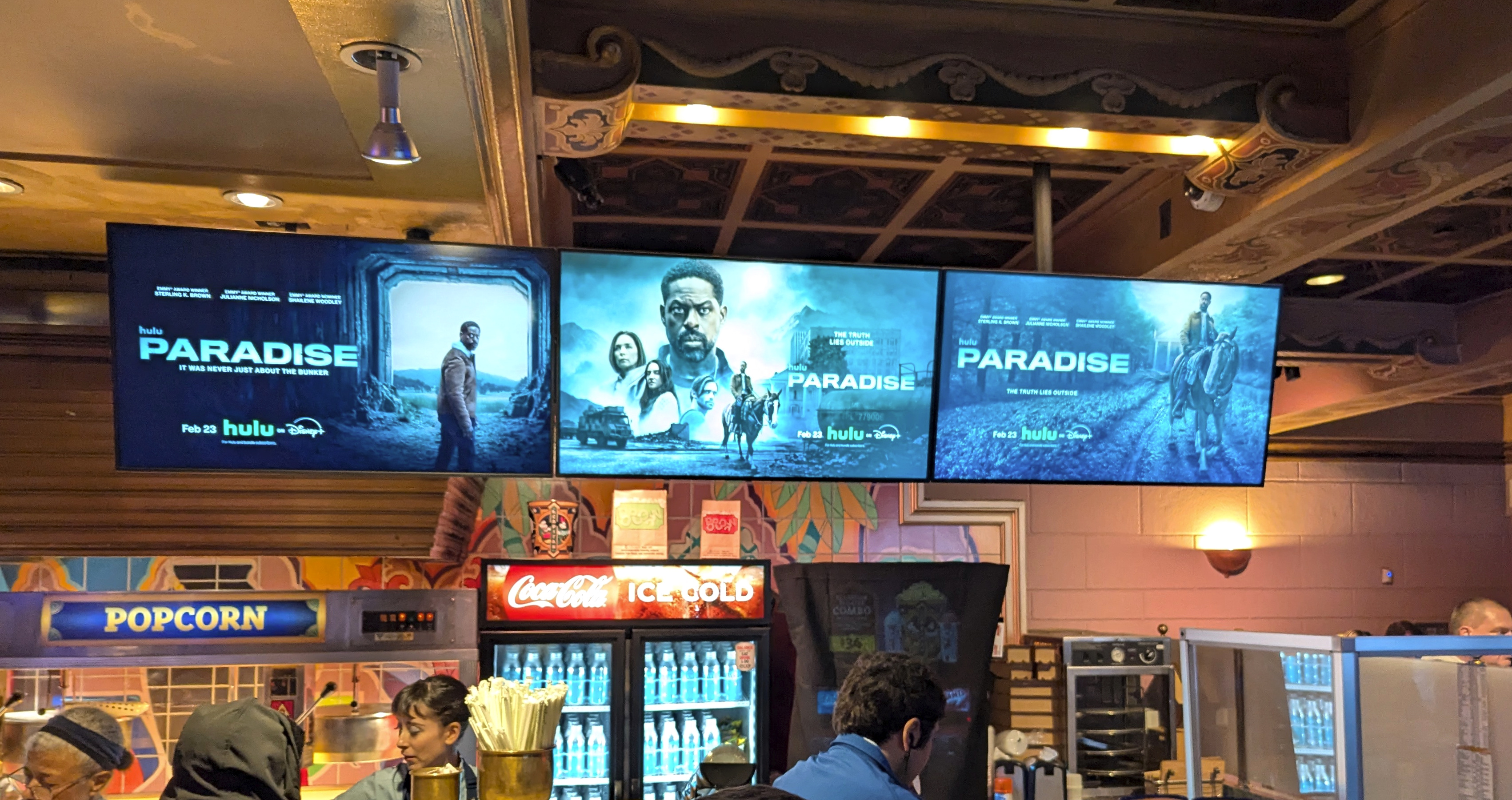 Digital posters lined the theater entrance, and once in the lobby, the details continued. The concession stand menu boards featured Paradise-themed graphics, and popcorn and a drink were included with admission. Two themed photo backdrops were also available.