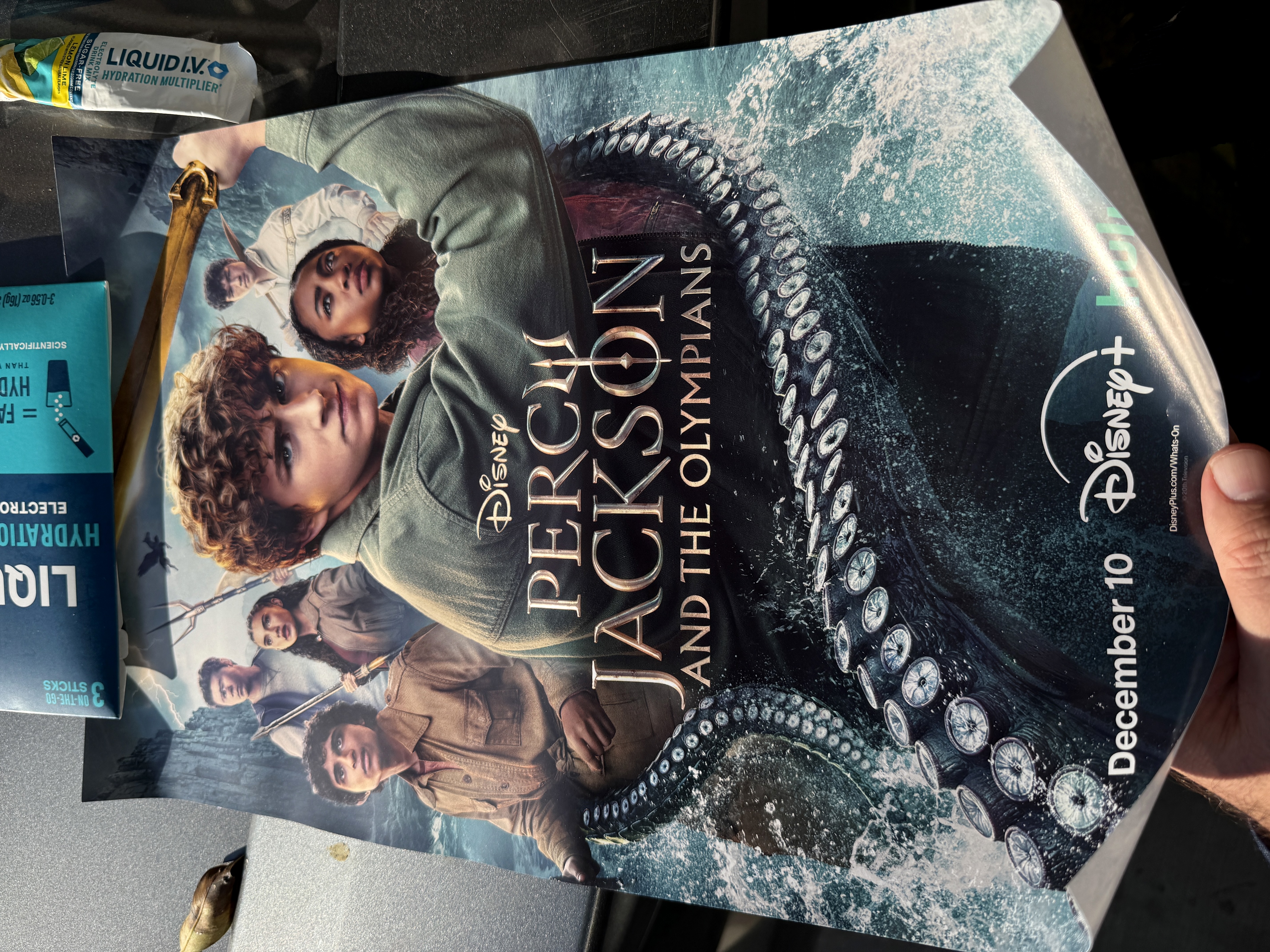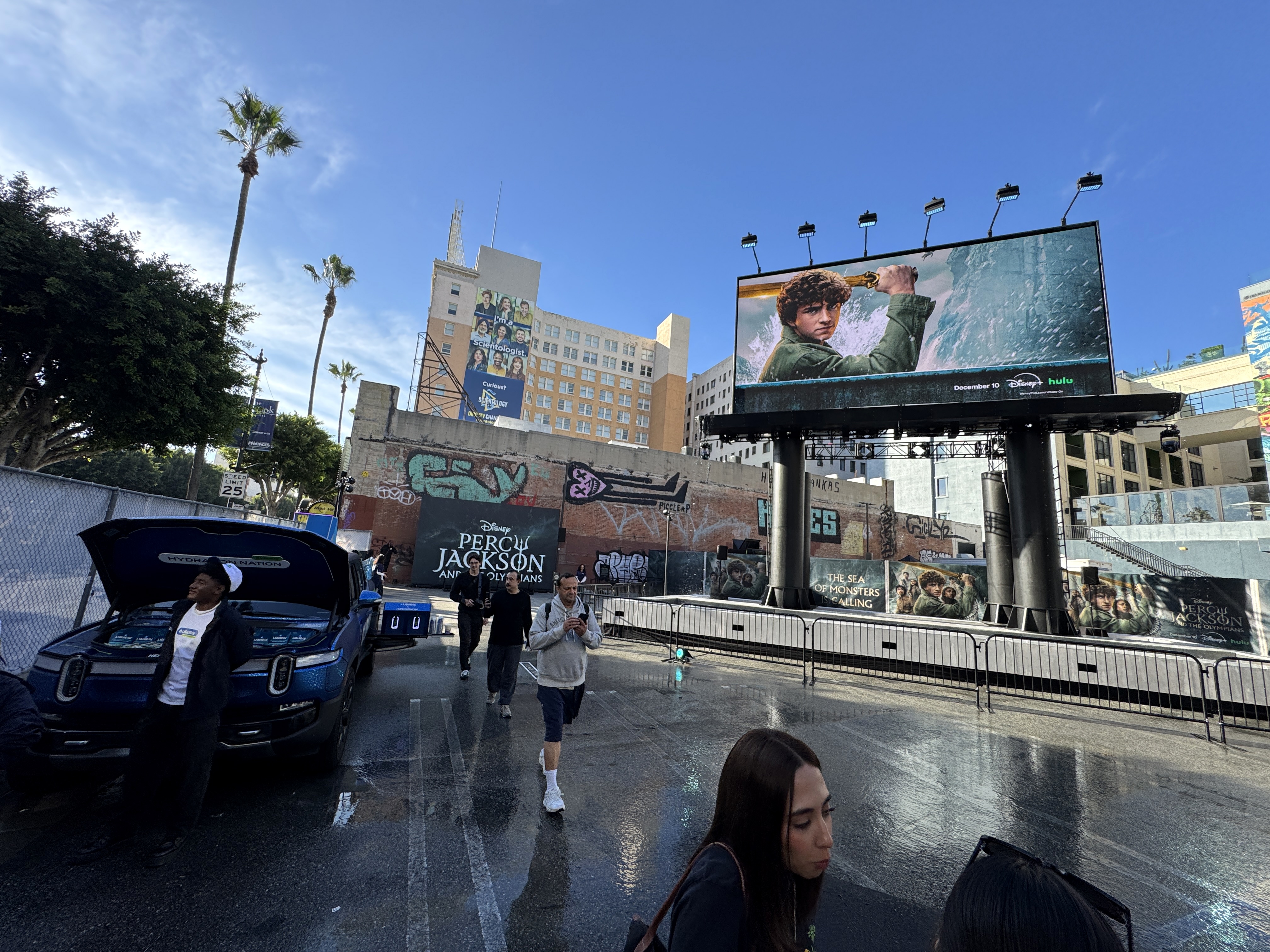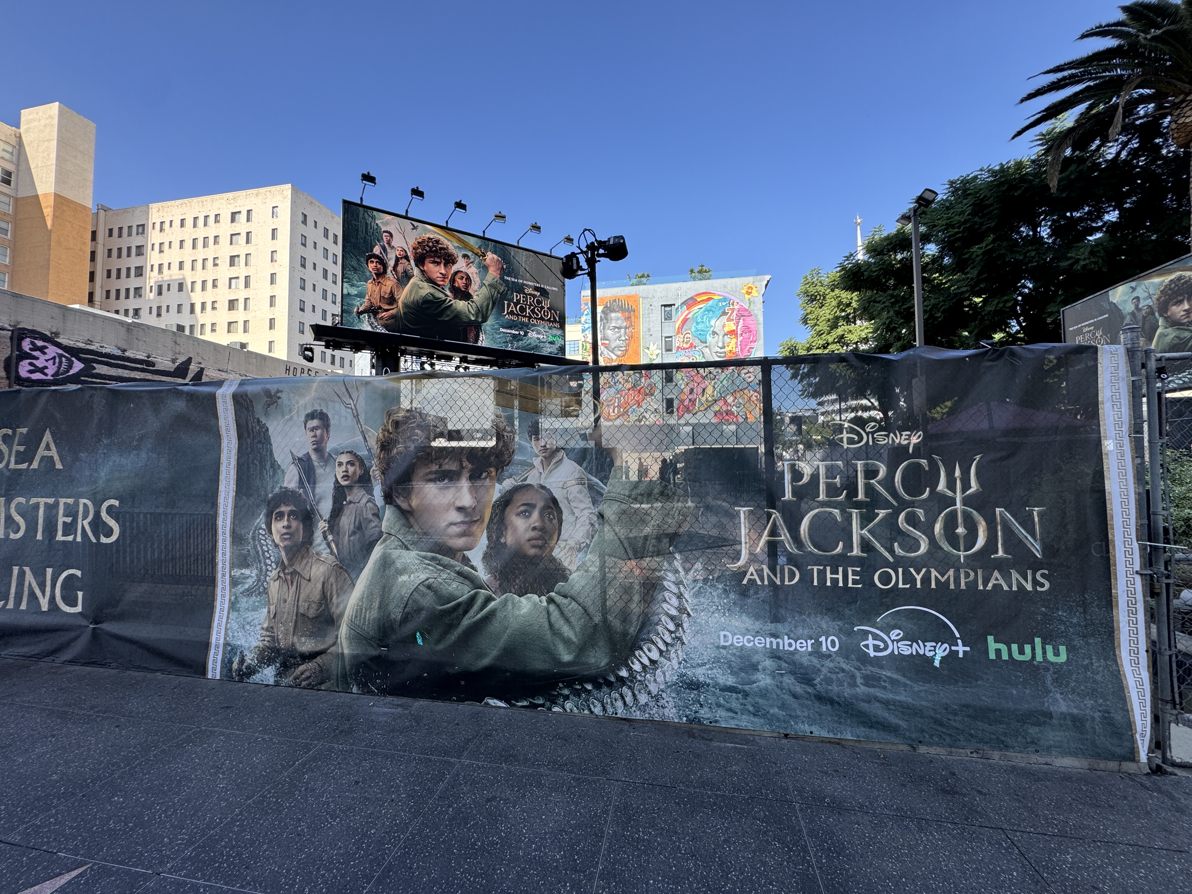 Approaching the corner of Hollywood and Vine, the Percy Jackson fun was immediately noticeable with themed scrims and billboards.