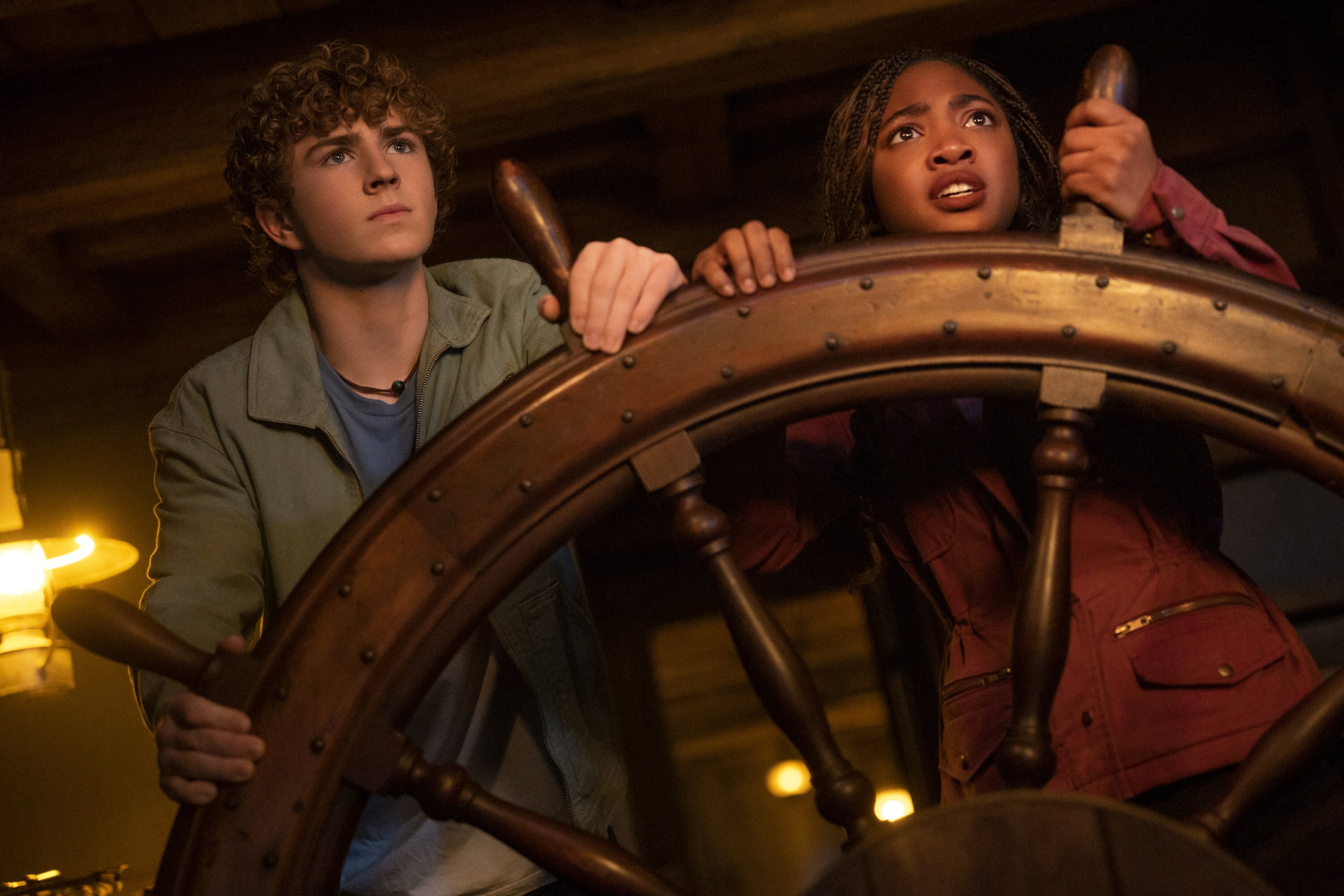 Annabeth (Leah Jeffries) has brought Percy and Tyson (Walker Scobell and Daniel Diemer) to a hiding place from long ago. Removing a hidden cache, she remembers back to when Luke (Charlie Bushnell) and her were on the run. We learn that the hidden cache of goods is something that he and Thalia had used before, and while the younger Annabeth is scared, Luke reassures her and gives her a special bracelet, that he claims is a magic protection charm, (it isn’t), and though the younger version of Annabeth is content, the present day Annabeth is remembering back to this moment, and the good that was once inside of Luke.