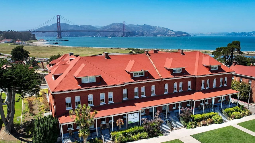 - The Lodge at the Presidio is a historic boutique hotel on the Main Post of the Presidio that’s been renovated into a comfortable and contemporary ‘basecamp’ for adventures in a unique national park setting. As San Francisco’s closest hotel to the Golden Gate Bridge, the modern rooms sport views of the forest, the bay, the City, the bridge, or a combination thereof. Guests escape the bustle of downtown and enjoy nature and recreation in the park while being steps away from excellent dining.