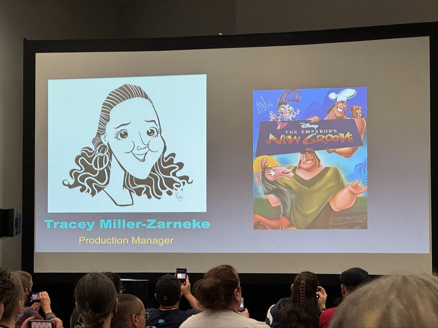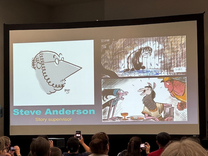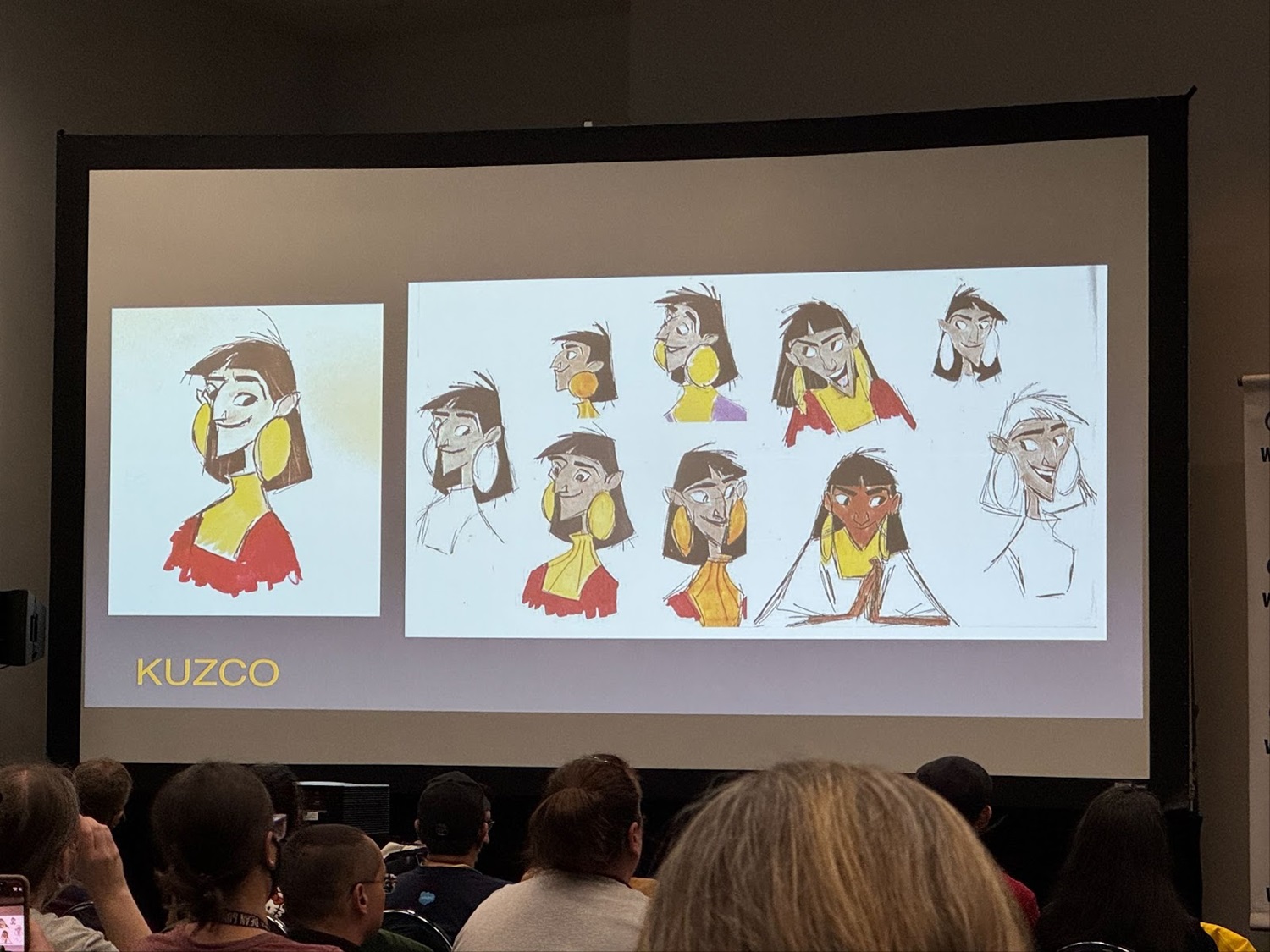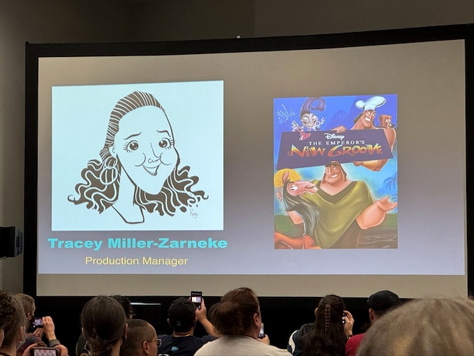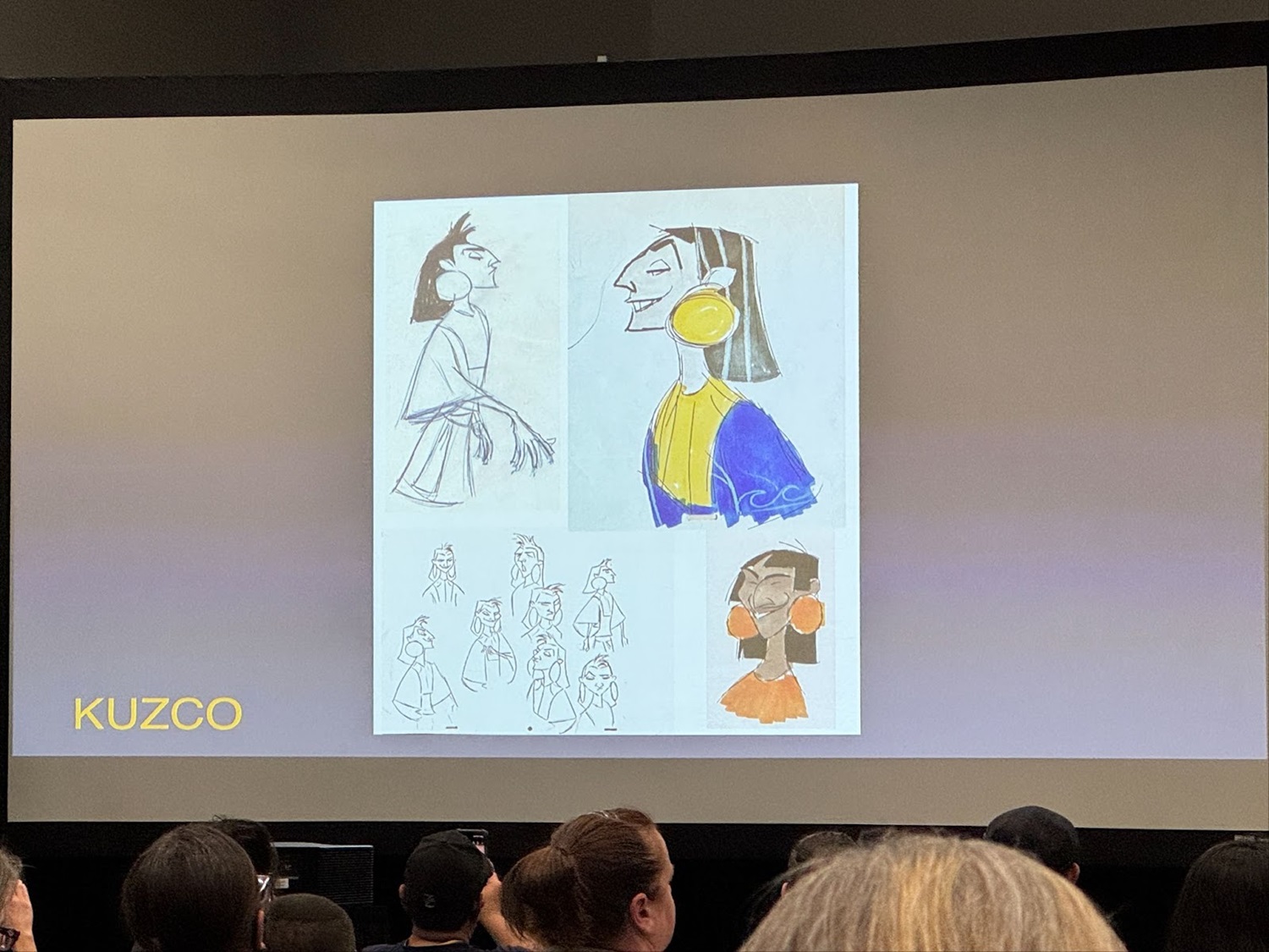 The panelists for this 25th anniversary discussion of The Emperor’s New Groove were as follows: story artist Jeff Ranjo (Moana), story supervisor Steve Anderson (Meet the Robinsons), character designer Joe Moshier (Spider-Man: Across the Spider-Verse), assistant production manager Tracey Miller-Zarneke (Chicken Little), and screenwriter Dave Reynolds (Finding Nemo).