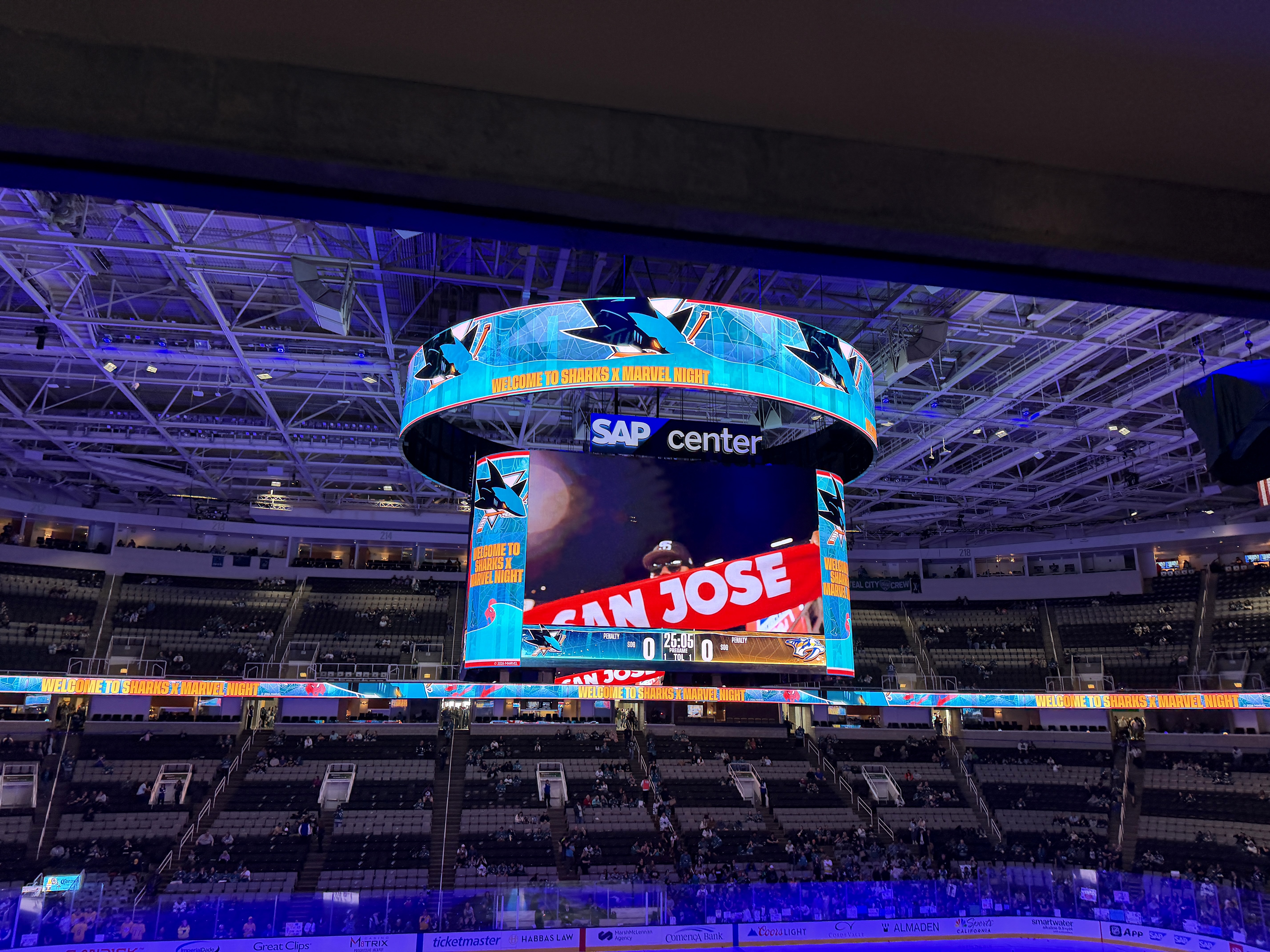 The Jumbotron welcomed hockey fans to Sharks x Marvel Night.