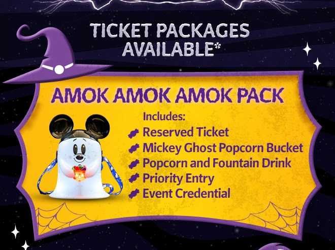 - Amok Amok Amok Pack - $78 (includes all fees) - includes a reserved seat, Mickey Ghost popcorn container with popcorn, fountain drink, and event credential and lanyard.