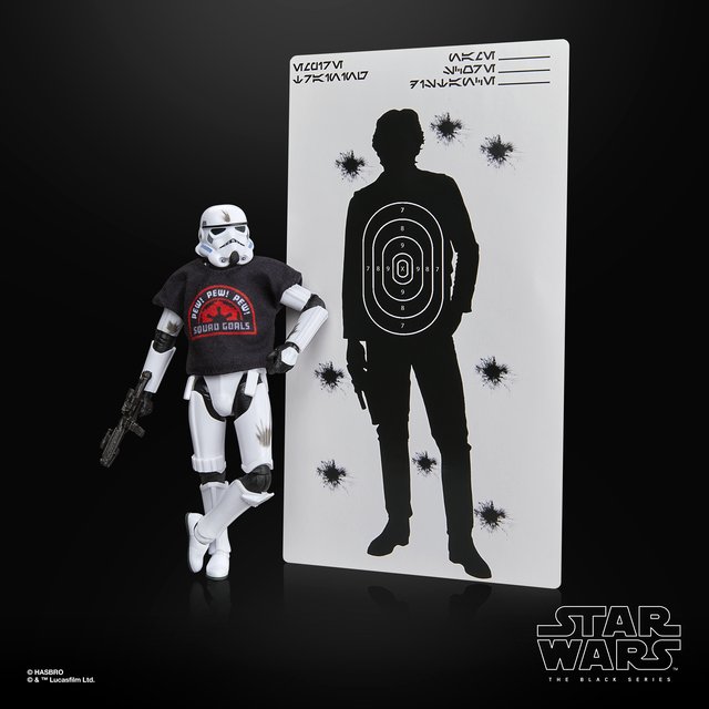 Perhaps the most tongue-in-cheek of the trio, the Stormtrooper figure sports a “Pew! Pew! Pew! Squad Goals” T-shirt, leaning fully into fandom humor. It also comes with a blaster and a target poster featuring Han Solo, one of the galaxy’s most beloved heroes. This figure will be available exclusively at Walmart.