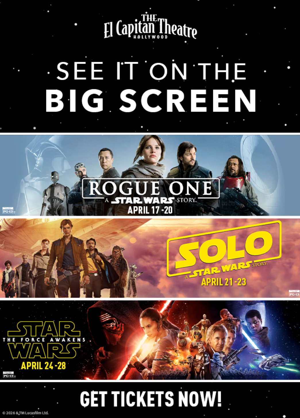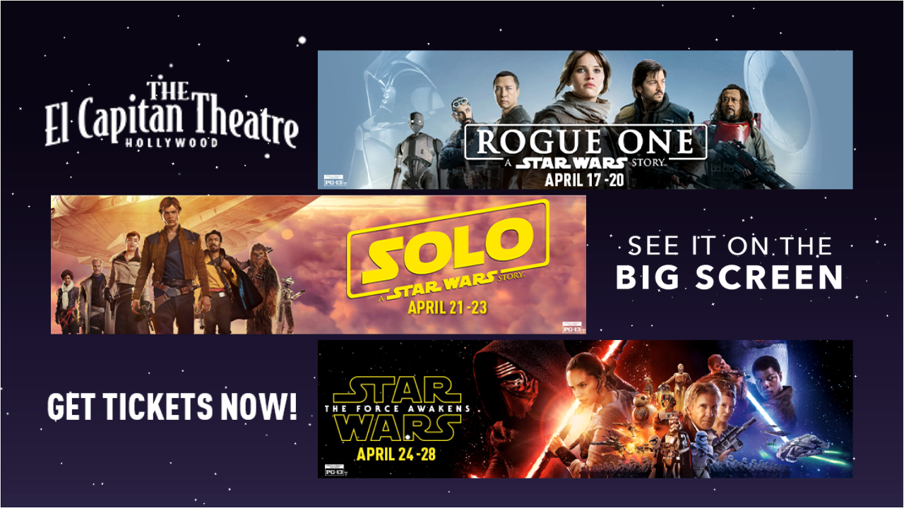 Rogue One, Solo, and The Force Awakens will screen in Hollywood this April ahead of Star Wars Day on May 4th.