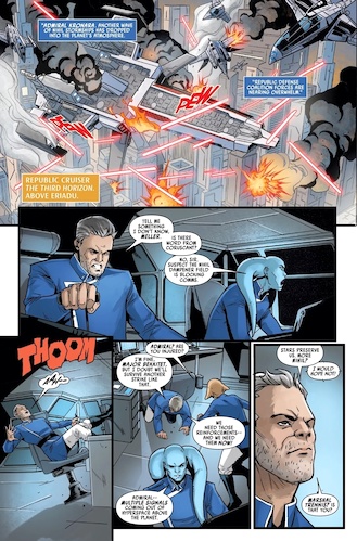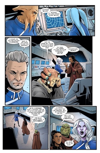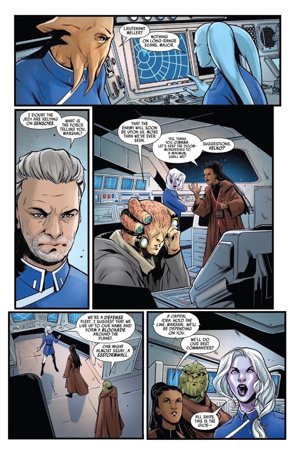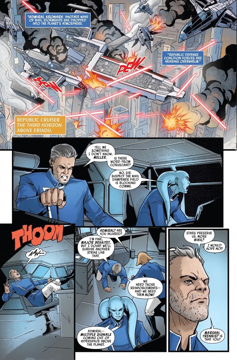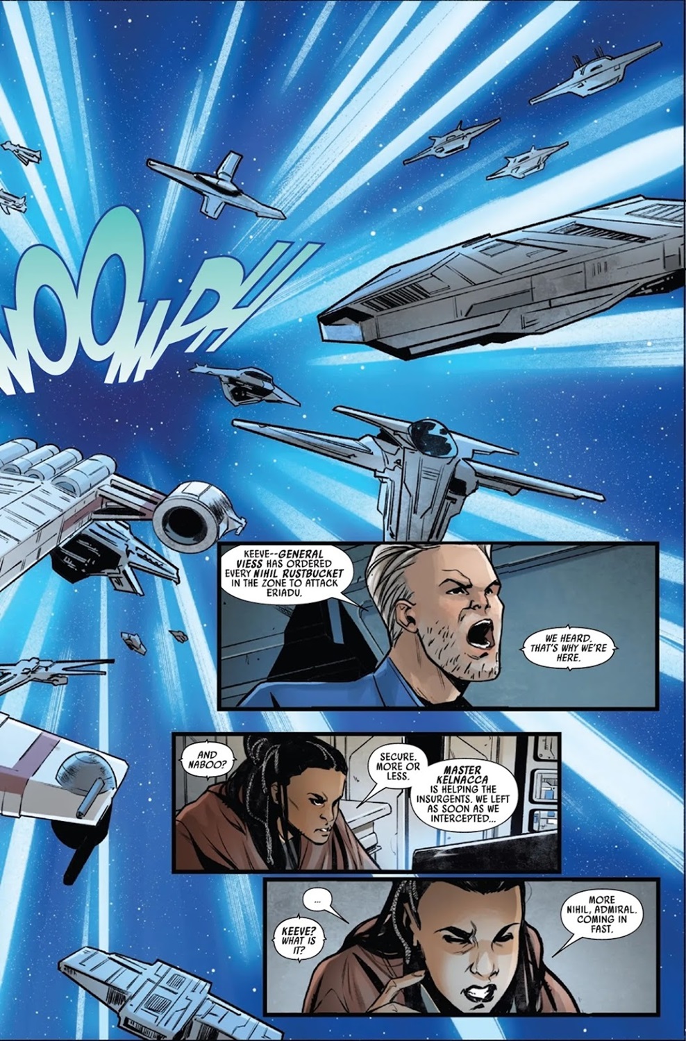 The High Republic - Fear of the Jedi #3 begins at the Battle of Eriadu, where Republic forces are being overwhelmed by the Nihil above the surface of the planet. Thankfully that’s when Keeve Trennis and her friends– fresh off the liberation of Naboo– arrive on the scene. Keeve orders all the starfighters off the Longbeam cruiser Gios and into the fray, fully intending to join them until she is stopped by Republic aide Velko Jahen. Velko convinces Keeve that she needs to stay aboard the ship and continue in her duty as commander, so Trennis puts Master Sskeer in charge of the fighters and retains the helm herself. Then outside in space we see Sskeer and the other pilots aghast as more Nihil reinforcements arrive.