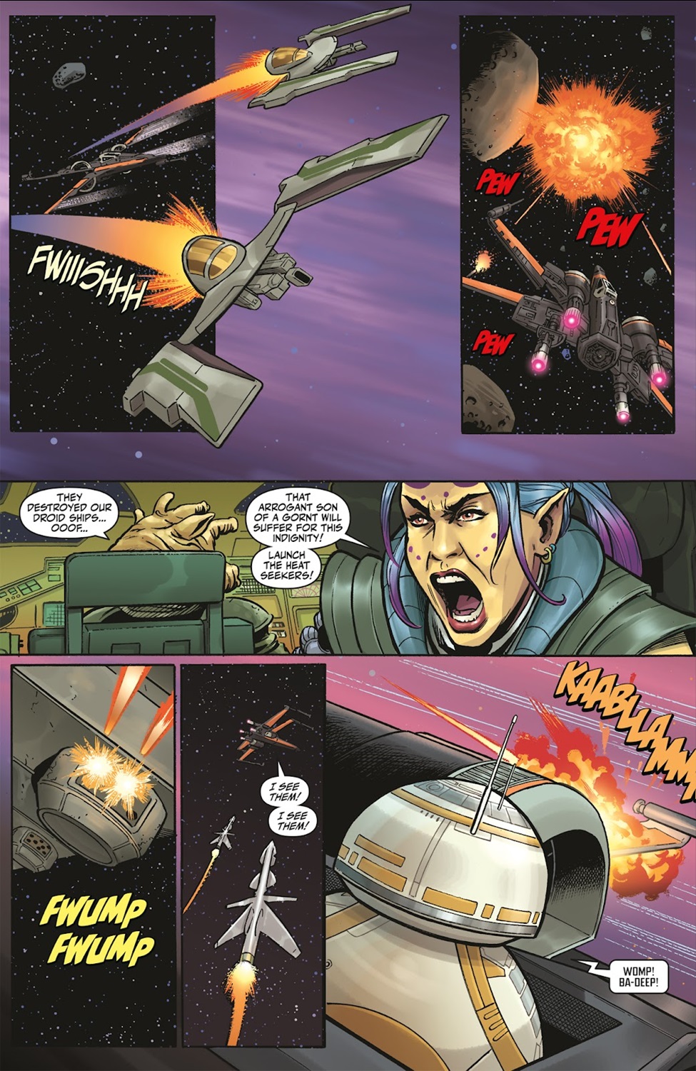 Anyway, after returning from this somewhat-unsanctioned rescue, Poe is approached by General Leia Organa (Wookieepedia informs me that this comic is set between issue #25 of Marvel’s Star Wars: Poe Dameron comic and The Force Awakens) about another secret mission: apparently the ever-expanding First Order has figured out a way to decrypt encoded Resistance messages and that method is housed on the Hutt-controlled planet of Nar Kaaga. So it’s up to Dameron, accompanied by his old pal and fellow Resistance pilot Temmin “Snap" Wexley– along with BB-8 and a few other X-wing pilots– to track down and destroy what they assume to be a codebreaking machine of some type. But because Poe’s usual starfighter is damaged from that previous task, he’s forced to take a different X-wing, which turns out to be good luck later on.
