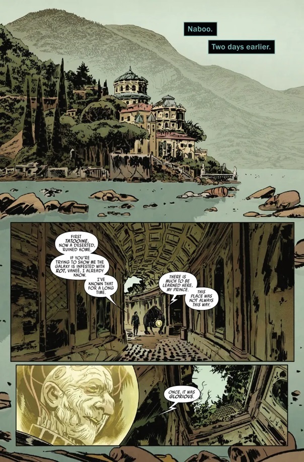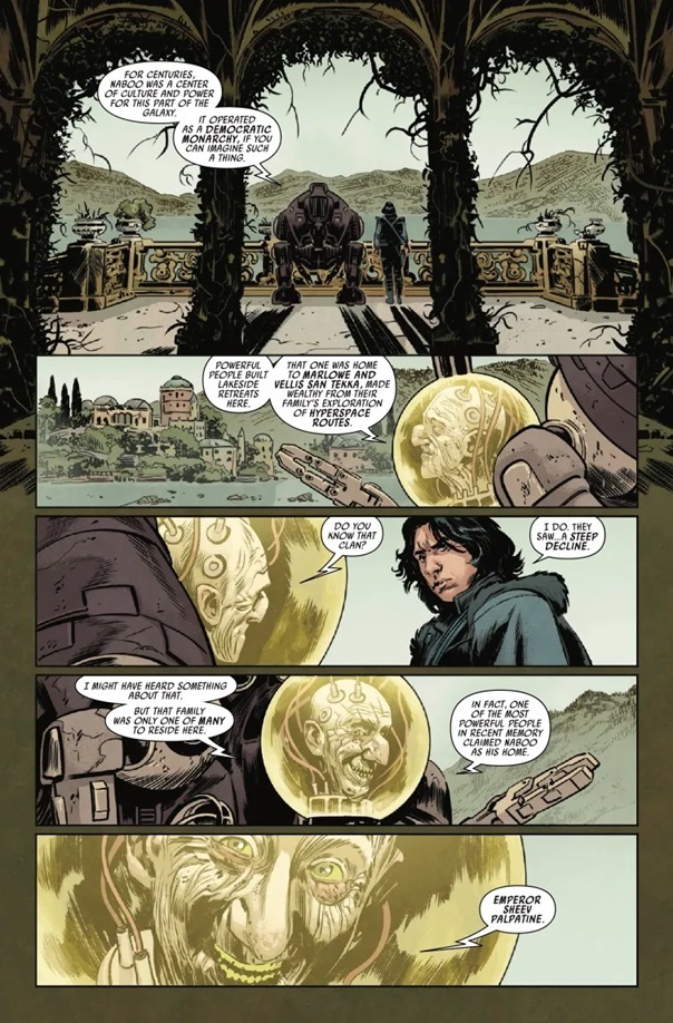 We get a really neat, hyper-stylized synopsis of Vader’s return to Naboo in the writer Greg Pak’s 2020 run on the Star Wars: Darth Vader comic, which led the locals to believe they would be executed for even remembering that Padmé existed. Then the four individuals are confronted by an aristocratic enforcer by the name of Storg Veruna, who insists that the dilapidated palace is now the property of the Veruna family and that they are openly trespassing. Naturally Kylo Ren is able to easily mop the floor with these toughs, but once manages to escape alive and that sends the other two locals into a panic. Ren kills them with a Force choke, tells Vaneé that he was wrong about the lesson to be learned from Anakin and Padmé’s relationship, and declares he’s going to teach the entirety of Naboo a lesson once and for all.