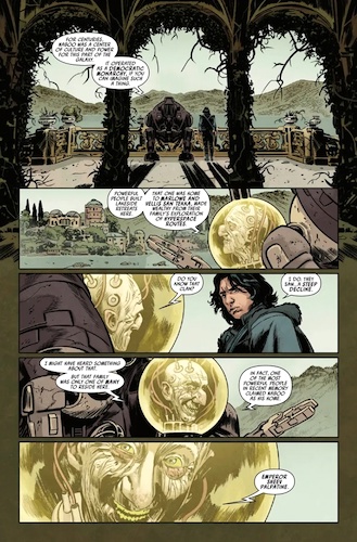 Legacy of Vader #4 begins on the First Order’s current flagship the Finalizer (as this comic is set in the wake of the destruction of Snoke’s Supremacy at the end of Star Wars: The Last Jedi) with Kylo Ren asking General Hux if their fleet still has enough firepower to destroy an entire planet. Long story short, Hux gives the affirmative, and writer Charles Soule then flashes back to two days earlier, when Ren and Darth Vader’s former attendant Vaneé are taking a tour of Kylo’s grandmother Padmé Amidala’s now-abandoned royal palace, which Ren first assumes once belonged to Senator-turned-Emperor Sheev Palpatine. Vaneé continues his history lesson about Naboo (which includes a fun nod to The High Republic), insisting that the lesson is for Ren to find something around which to center himself. And after Kylo berates the disembodied attendant for wasting his time, they are approached by two locals who warn them not to hang around the “cursed" palace.