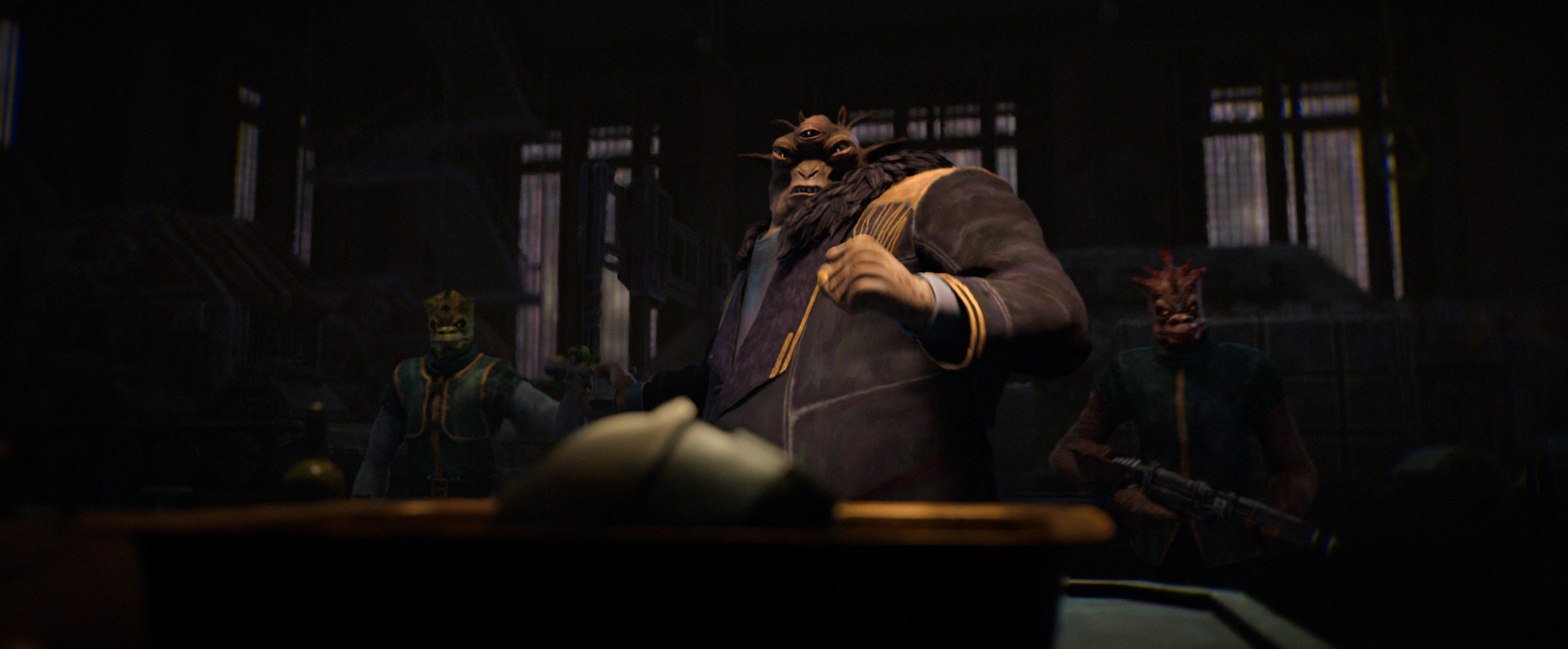 "My home, my family, my brother-- all taken from me," Maul mutters to himself. "Sidious, you did this to me!" Next we're back up in the city, where Devon sneaks into a parking garage and steals a nice-looking speeder from some particularly mean aliens who try to stop her only to be knocked unconscious off-screen. At police HQ, Two-Boots escorts Rylee down the hallway and tells the stormtroopers there that it's a "prisoner transfer," echoing a moment from the original Star Wars movie. But the troopers don't buy it, and Two-Boots is forced to stun them with his blaster. He takes Rylee outside and they meet up with Lawson, who thanks him. "How did you know it was me? I'm not wearing my boots," Two-Boots asks, but Brander says he would know his partner anywhere. Lawson is prepared to turn himself in in exchange for Rylee, but Two-Boots tells him that the deal is off as stormtroopers erupt from the doors of the building.