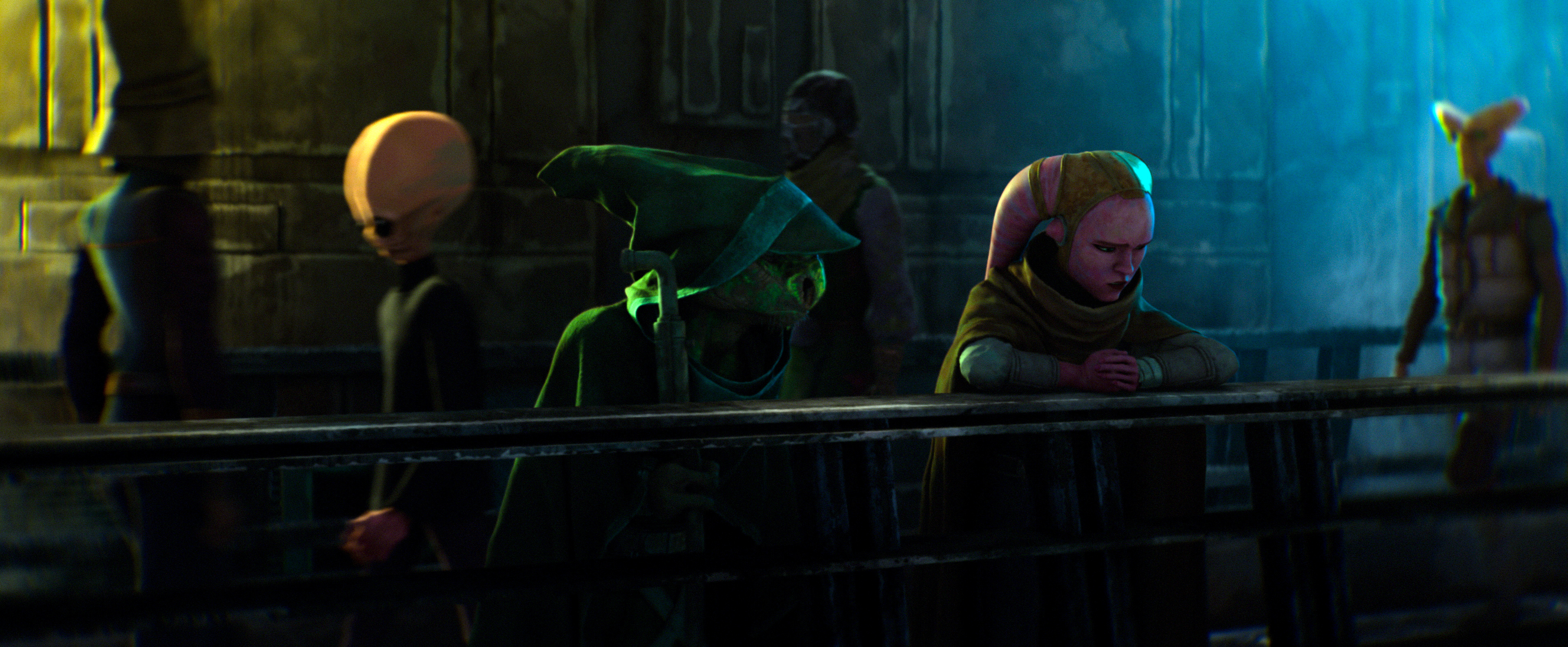 Still, on the whole I believe that Maul - Shadow Lord's strengths definitely override its weaknesses, and beyond the visuals I would list the voice cast as one of its biggest assets. Witwer alone has proven himself to be a commanding, compelling presence in the Star Wars pantheon, and he's joined here by some undeniable powerhouses, both veterans in the industry and those newer to the voice-acting game. The action scenes are well-choreographed as well, and fans of Maul's lightsaber-twirling combat style will be more than satiated by what they find here. So ultimately I'll say viewers should check out this series primarily for its jaw-dropping look, then prepare to enjoy the characters and performances and lightsaber duels, but maybe brace yourself for a few batches of frustratingly circular storytelling. Again, I'm only basing that on the first 80% of the season-- the finale and its preceding, penultimate episode may very well completely knock it out of the park and change my perspective on what I saw as shortcomings. For now, I predict that anyone who's been looking forward to this show since it was announced will be more than satisfied with the finished product.