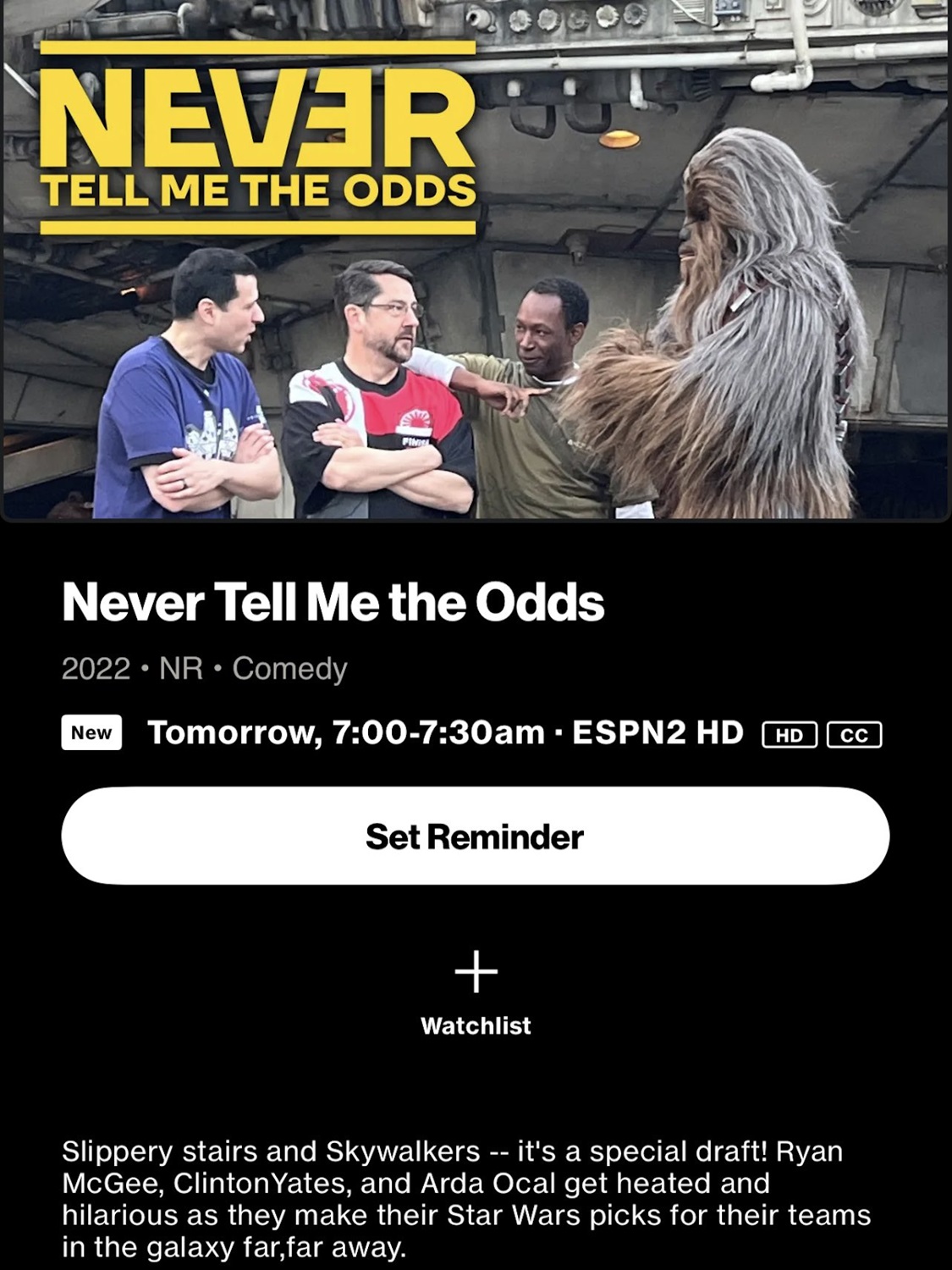 ESPN’s Star Wars podcast - yes, you read that right—Never Tell Me the Odds (Apple, Spotify), is making a rare appearance on television this early Sunday morning, August 3rd. The show will air on ESPN2 at 7:00 AM Eastern / 4:00 AM Pacific as part of The Ocho Special, ESPN’s annual showcase of obscure and offbeat sports.