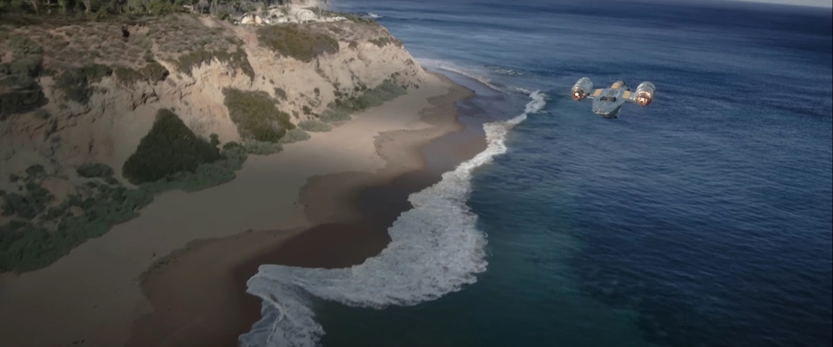 Shot 1: A Razor Crest model ship (ST-70 class assault ship) flies into frame and soars over a coastline. Obviously Din Djarin’s Razor Crest was destroyed in The Mandalorian season 2 episode “The Tragedy," but it seems as though he’s managed to procure a new one. The planet is not identified on-screen, but the beachy landscape and structures on the cliff look an awful lot like the New Republic Adelphi Outpost we’ve seen in The Mandalorian previously.