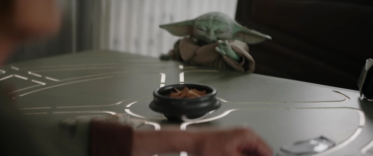 Shot 8: Grogu uses the Force to pull the bowl of snacks toward him.