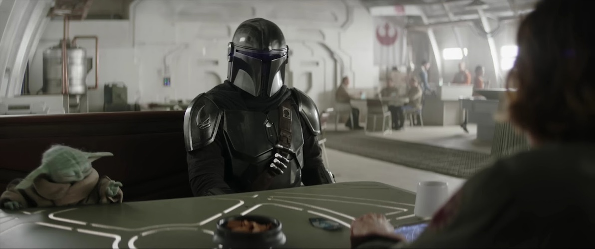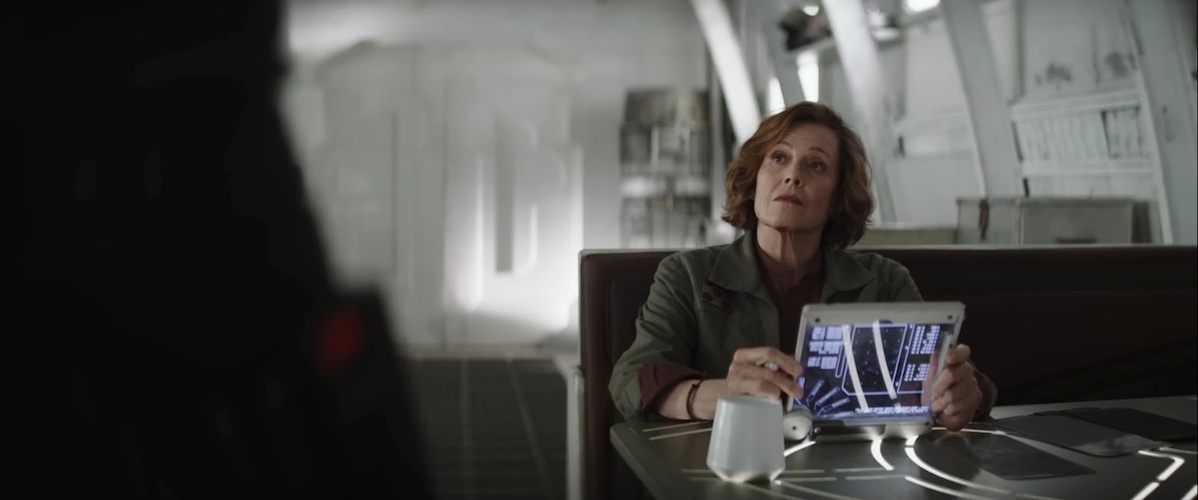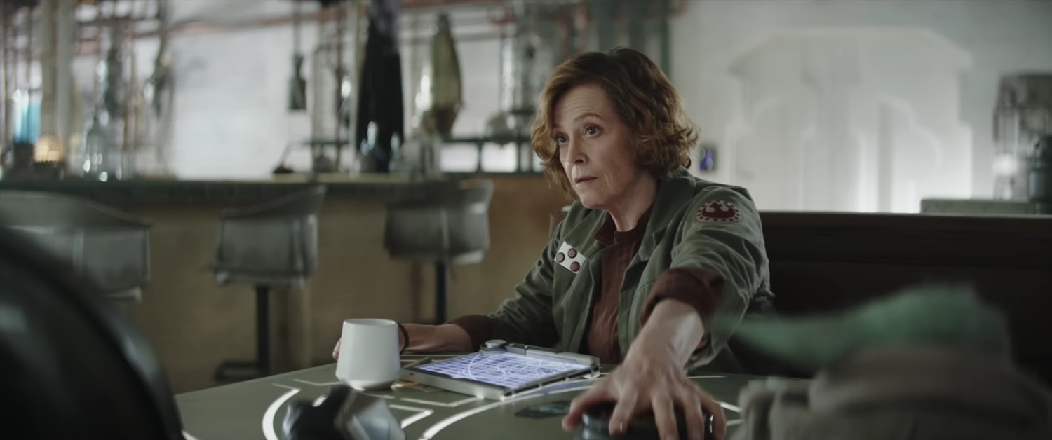 Shot 5: New Republic Colonel Ward (played by Sigourney Weaver from Alien and Ghostbusters) sits at a booth and looks up from her datapad as someone approaches, probably Din Djarin. My guess is that this is Adelphi base, as it appears to be structurally similar to what we’ve seen on the show.