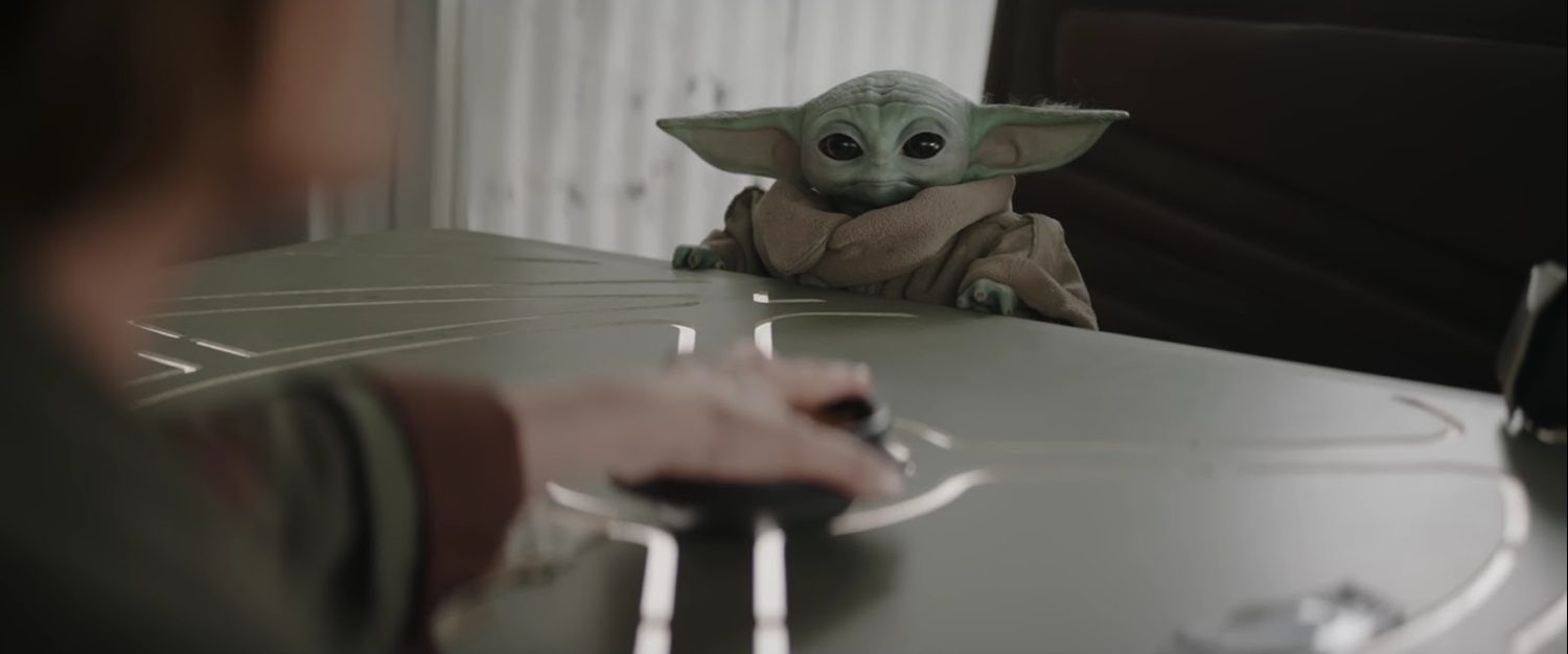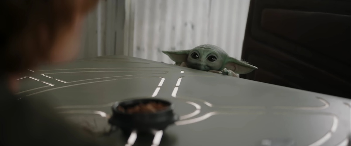 Shot 6: Grogu pops up in the booth opposite Ward. We see that there is a bowl of snacks in the middle of the table.